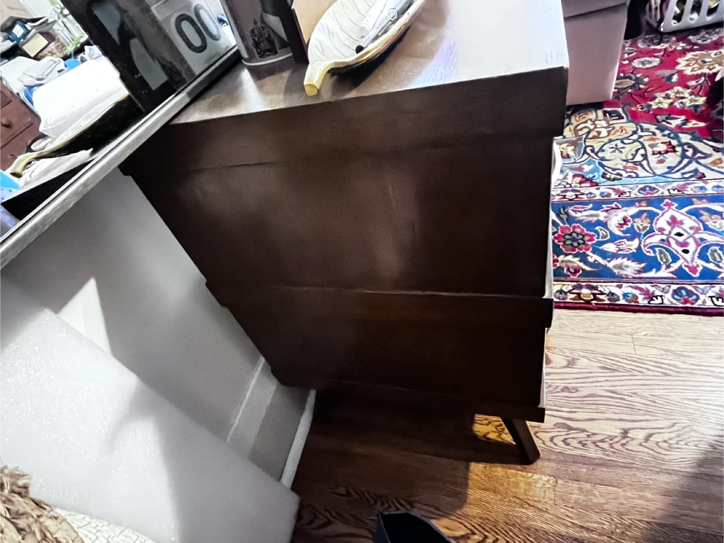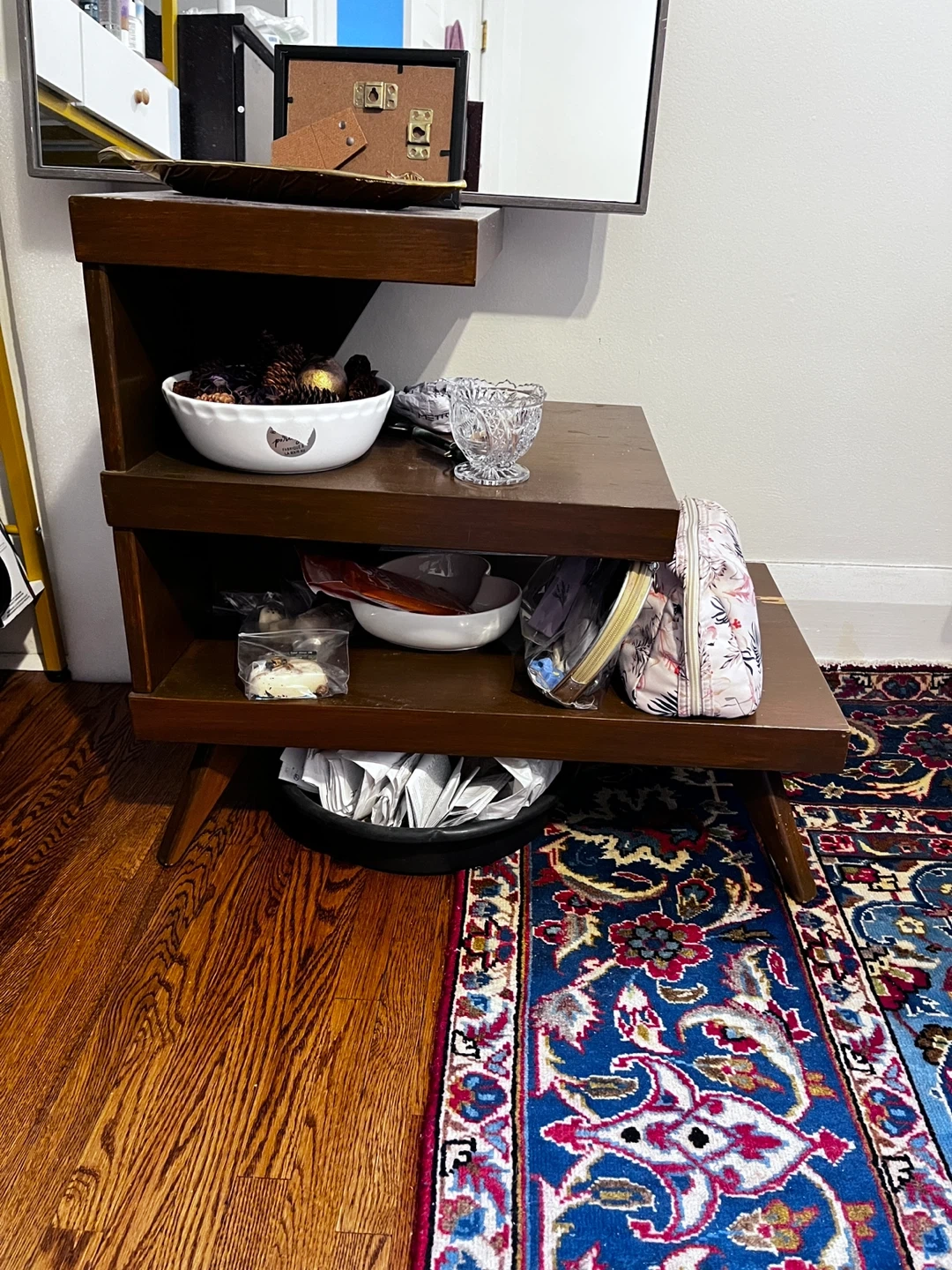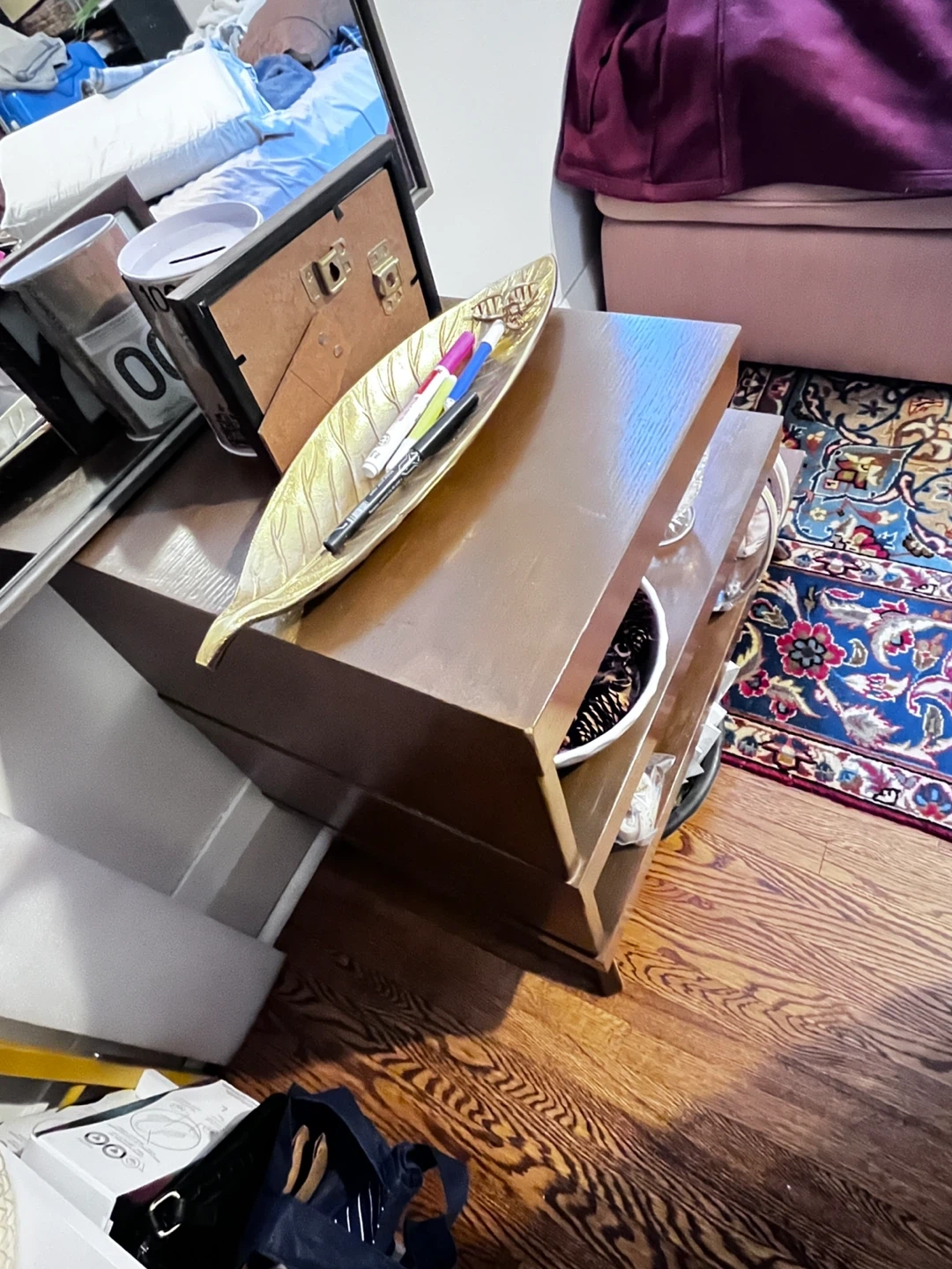 I am moving out by 28th December need to sell this unique brown wooden bedside table. It’s in good condition and has a tiny spot of discoloured. Perfect for adding a touch of vintage charm to any room.