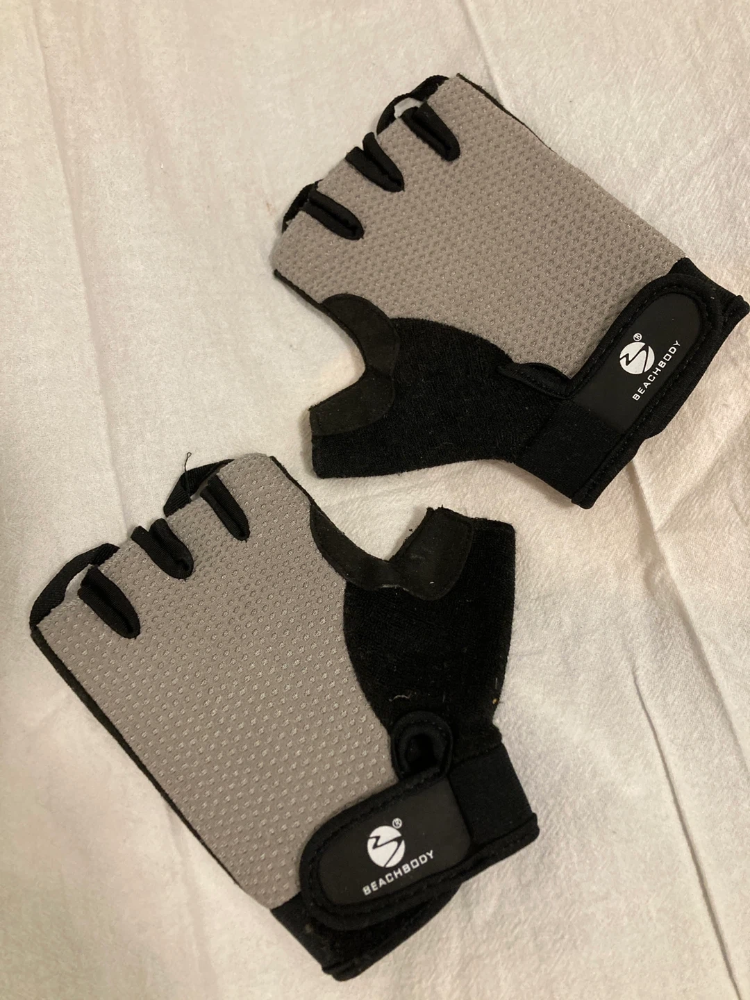 These are black and grey fingerless workout gloves from Beachbody. They're designed for weightlifting and gym use, offering grip and hand protection. They feature a secure velcro strap closure for a snug fit.