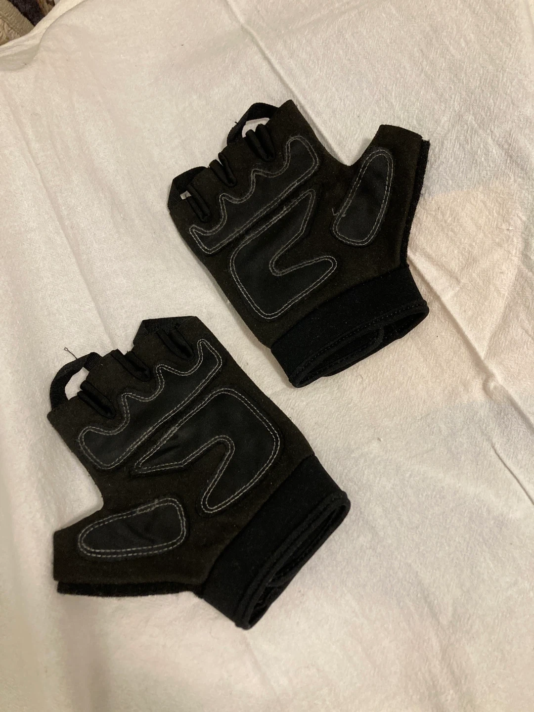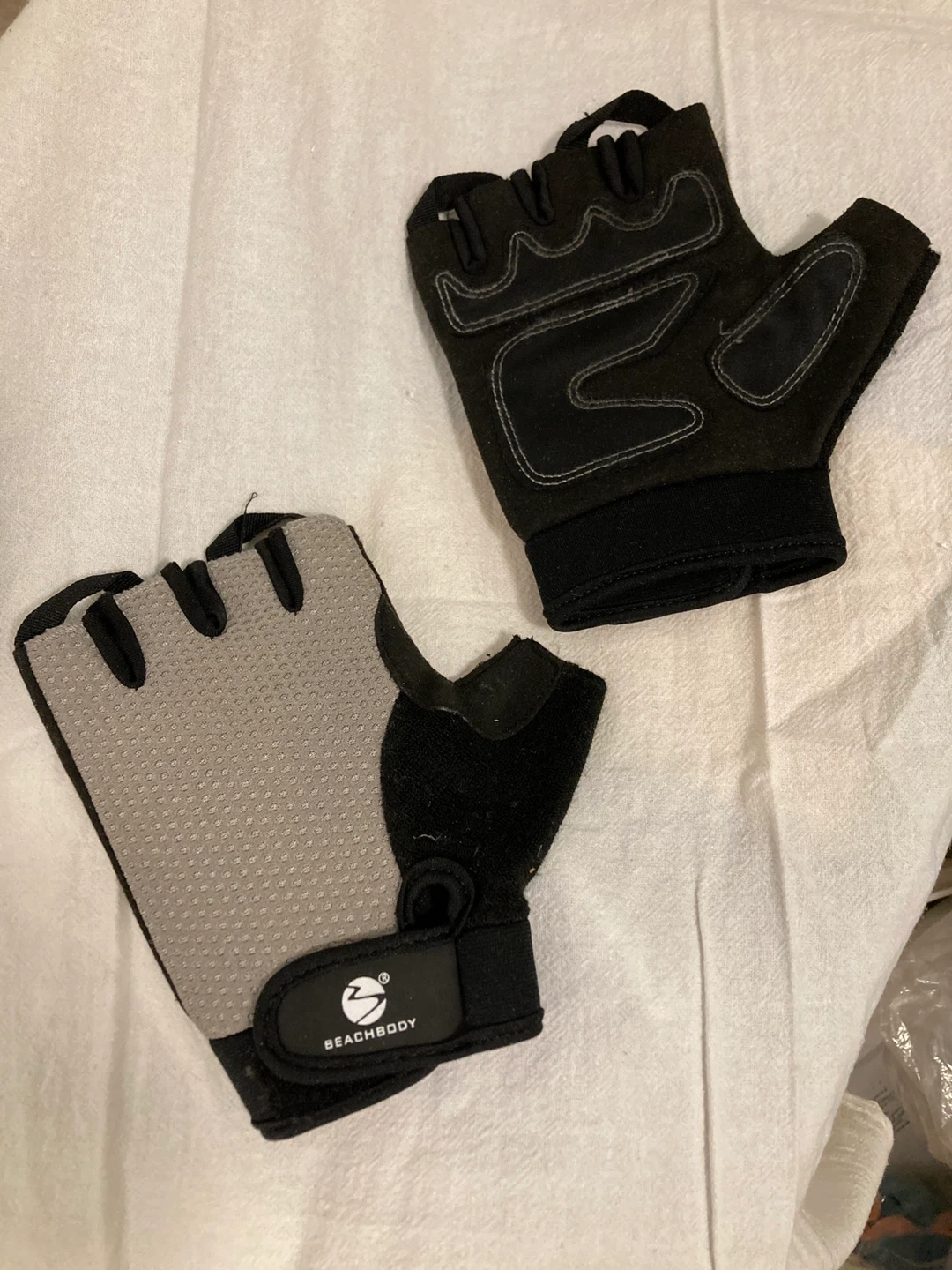 These are black and grey fingerless workout gloves from Beachbody. They're designed for weightlifting and gym use, offering grip and hand protection. They feature a secure velcro strap closure for a snug fit.