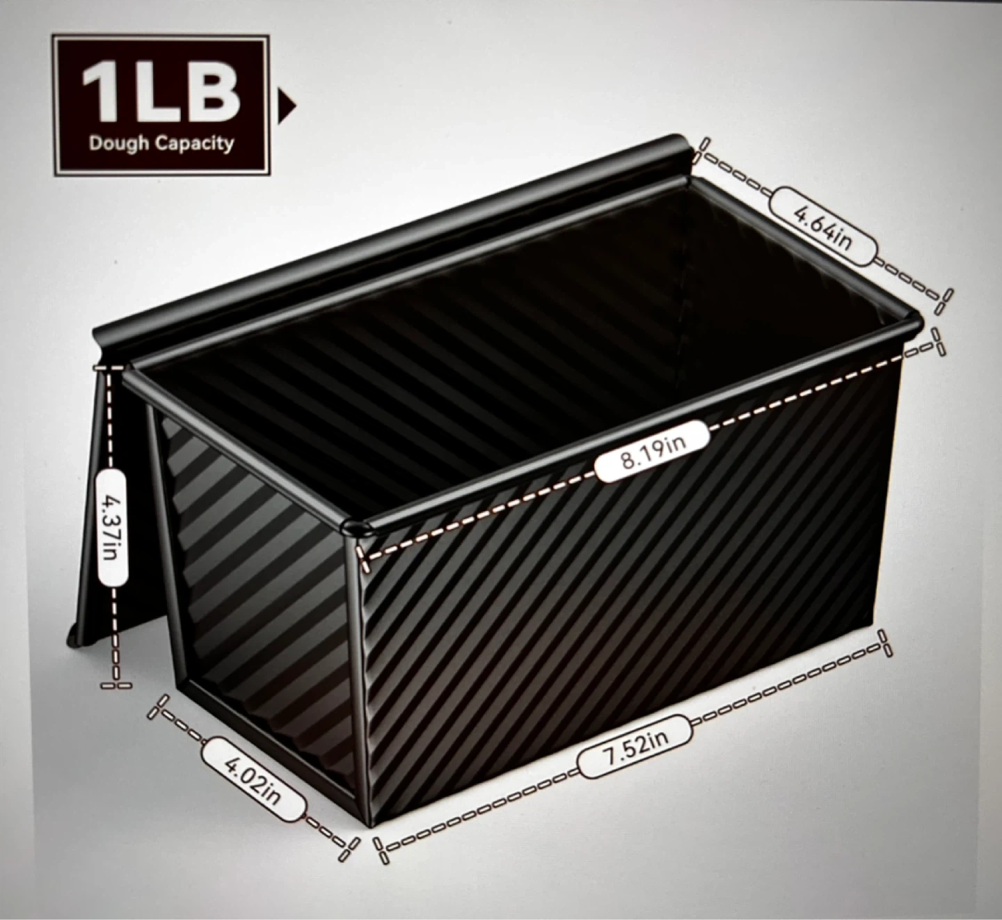 This toast mold bread pan is designed for professional baking experiences. It has a 1LB dough capacity and features a non-stick surface for easy release. The dimensions are 8.19in x 4.02in x 4.37in.