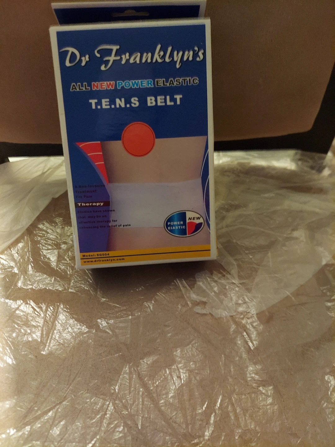 This is Dr. Franklyn's All New Power Elastic T.E.N.S. Belt, designed for non-invasive pain relief therapy. It's an elastic belt model SG004. This belt is made to offer therapy for enhancing pain relief.