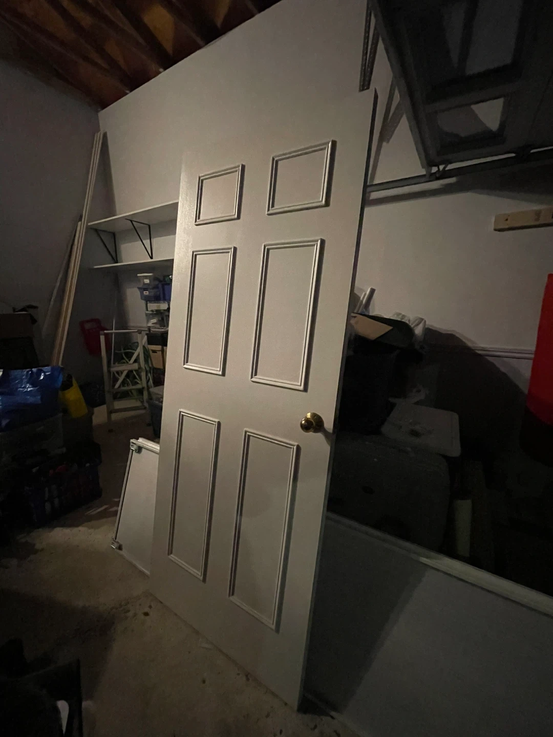 White interior door with six raised panels. Comes with a gold-coloured doorknob. Ready for installation in your home!