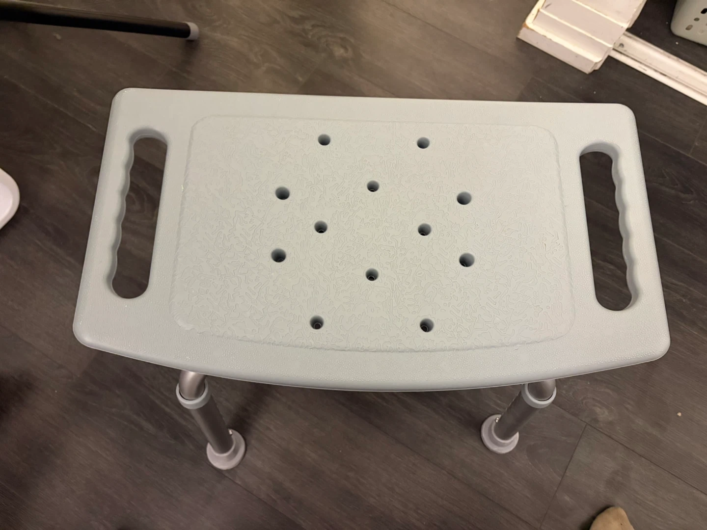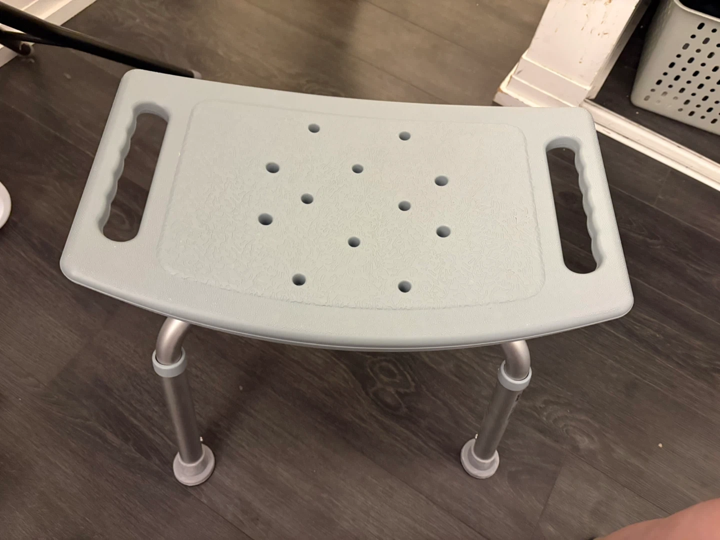 This bath chair provides a stable seating option in the shower. It features built-in handles for added support. The seat has drainage holes to prevent water buildup.