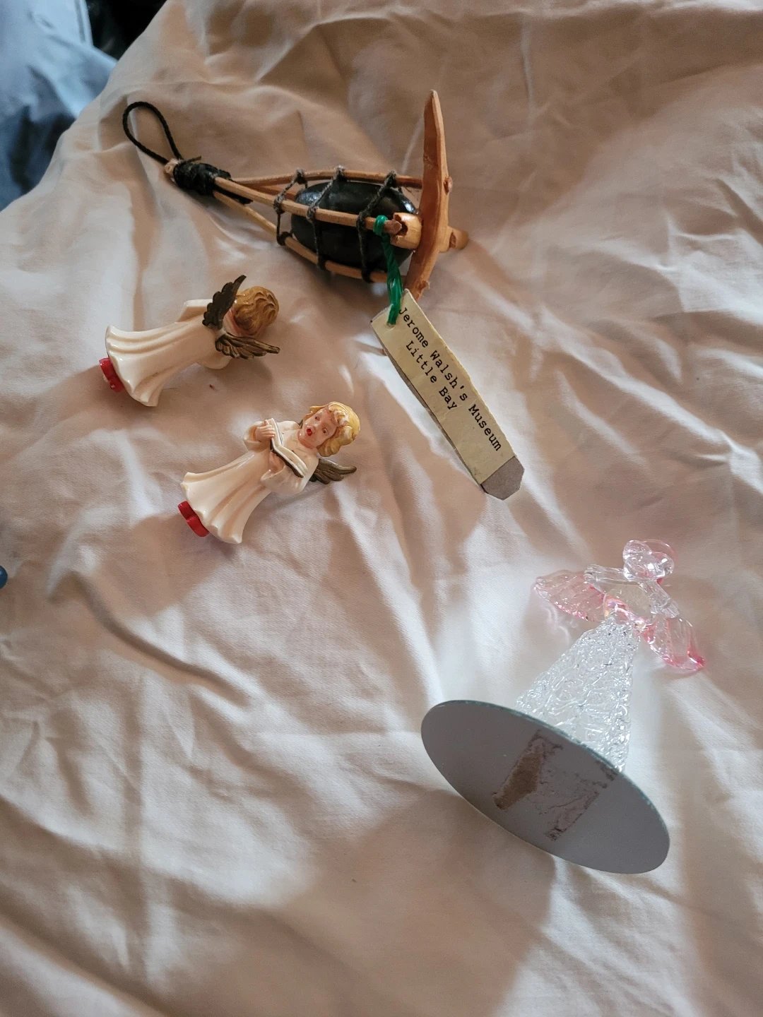 This set includes three small decorative angels and a nautical-themed ornament, possibly an anchor. One angel is clear acrylic with pink accents. Another tag reads 'Jerome Walsh's Museum Little Bay'. A third tag states 'Killick N.F.L.D. Anchor'.