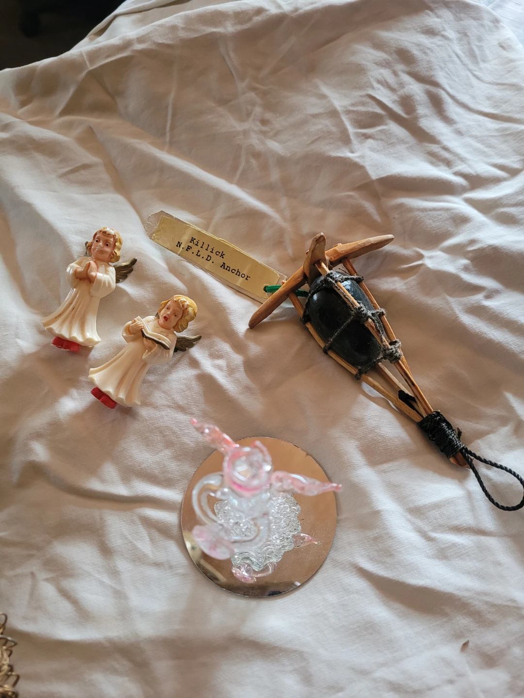 This set includes three small decorative angels and a nautical-themed ornament, possibly an anchor. One angel is clear acrylic with pink accents. Another tag reads 'Jerome Walsh's Museum Little Bay'. A third tag states 'Killick N.F.L.D. Anchor'.