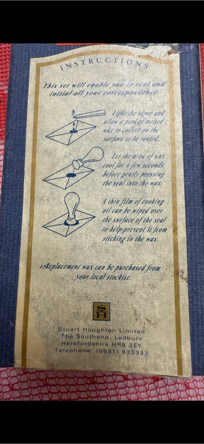 Selling a Stuart Houghton Personal Seal Set with Wax. This set will enable you to seal and initial all your correspondence. The box includes instructions.