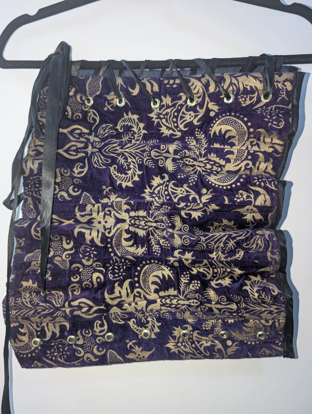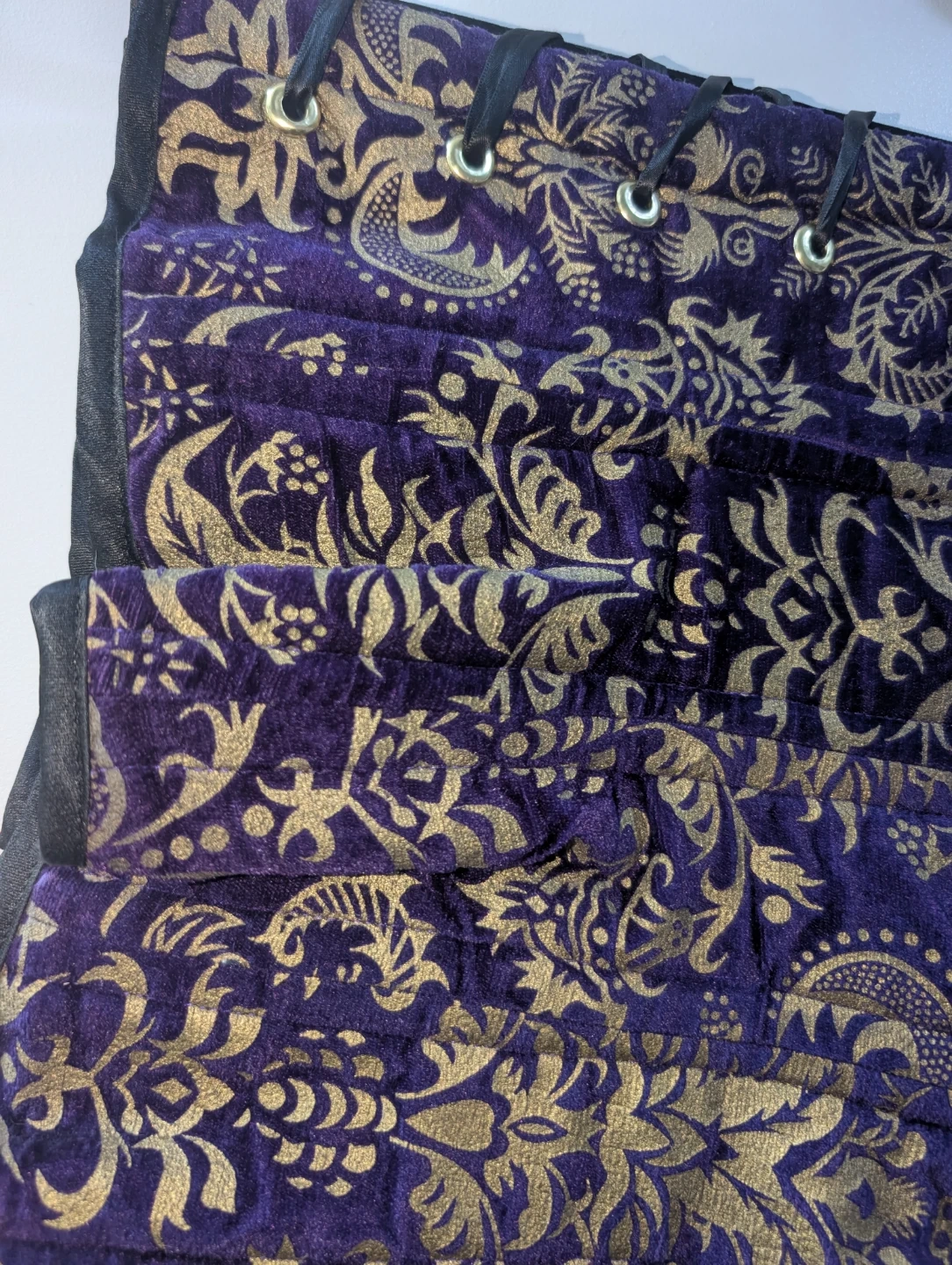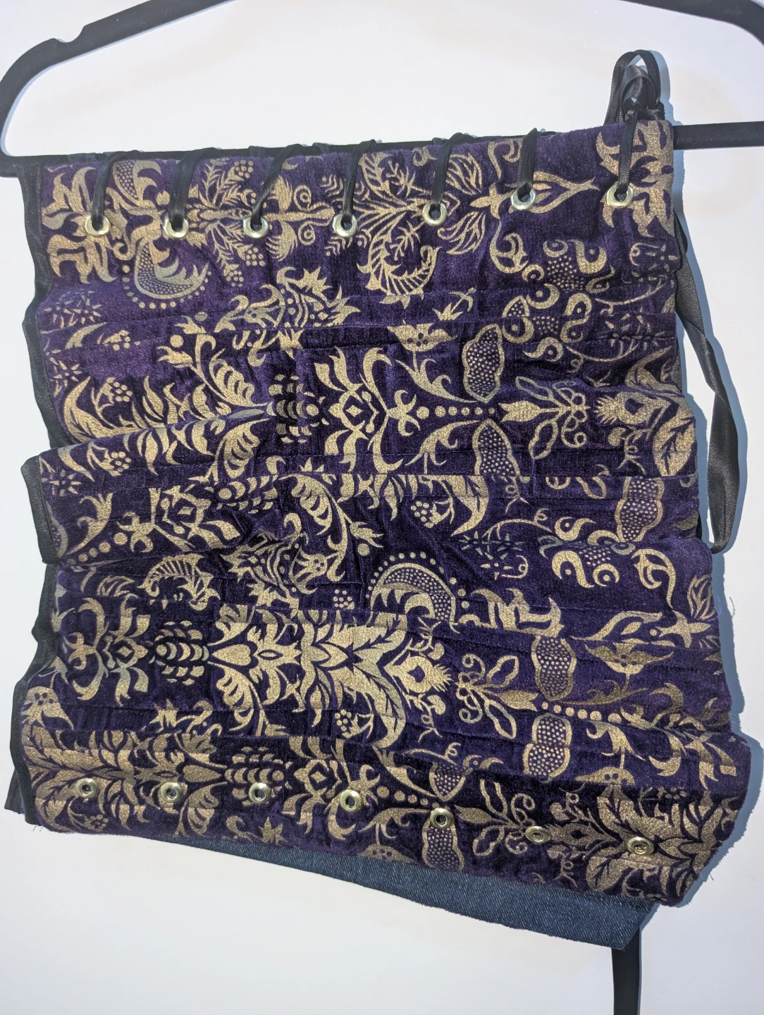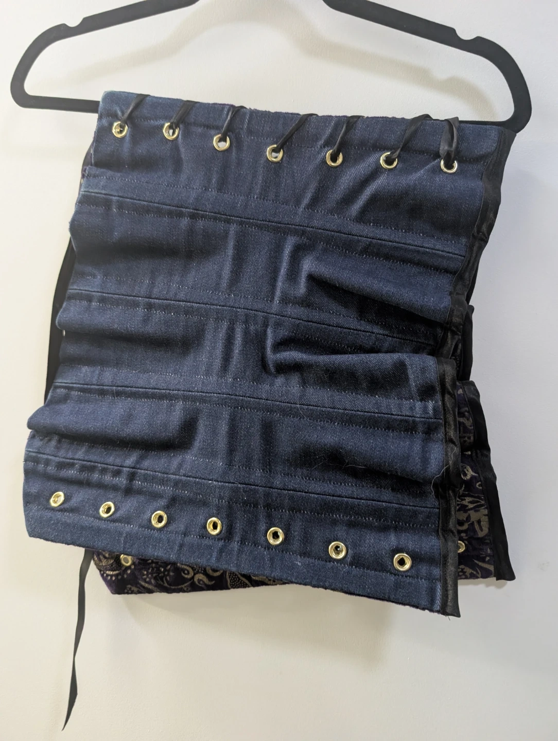 This corset is reversible - a purple velvet with an intricate gold damask pattern on one side and a dark denim front with gold grommets and black lacing. It's designed for a snug fit and stylish look