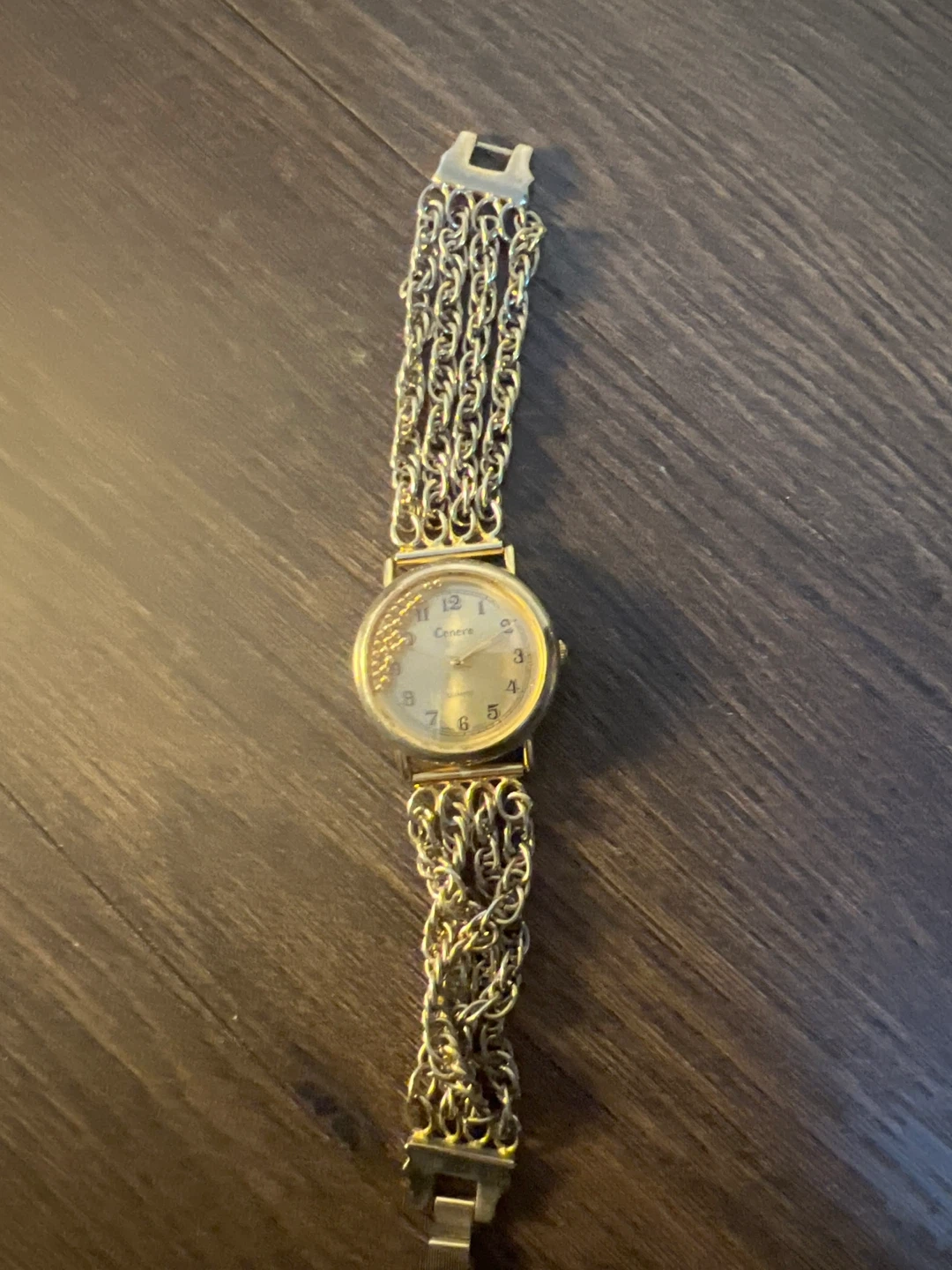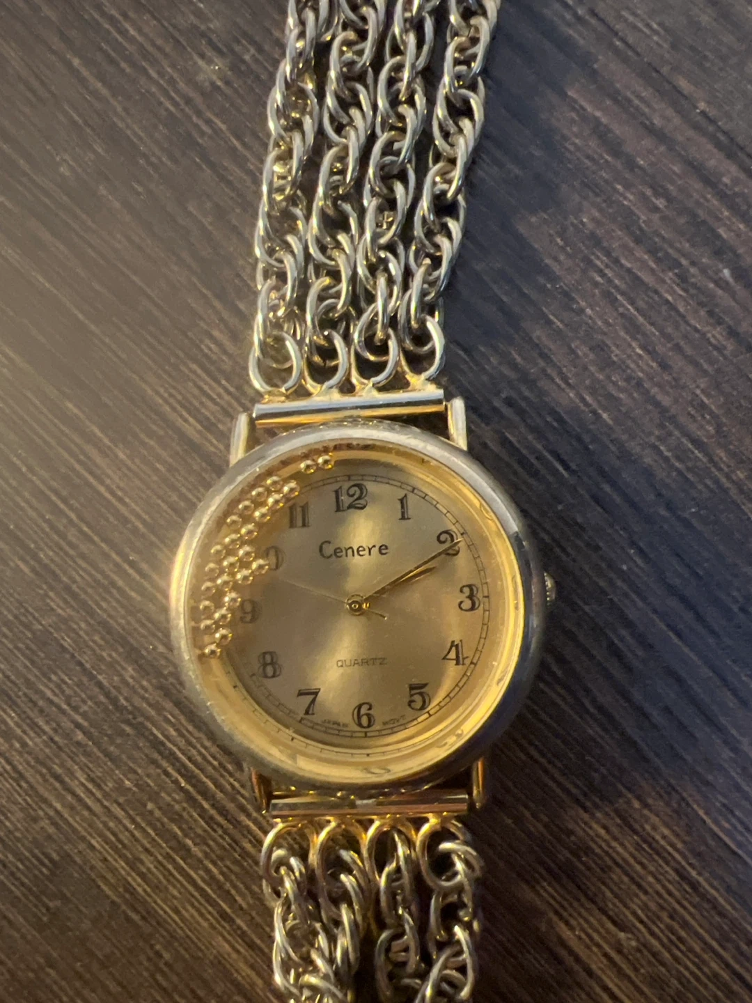 Selling a Cenere Quartz ladies watch. It has a unique chain-style band and a gold-tone face. It's a stylish piece that can add a touch of elegance to any outfit