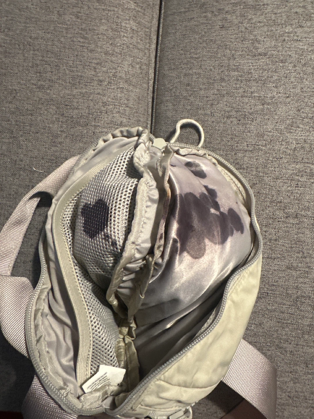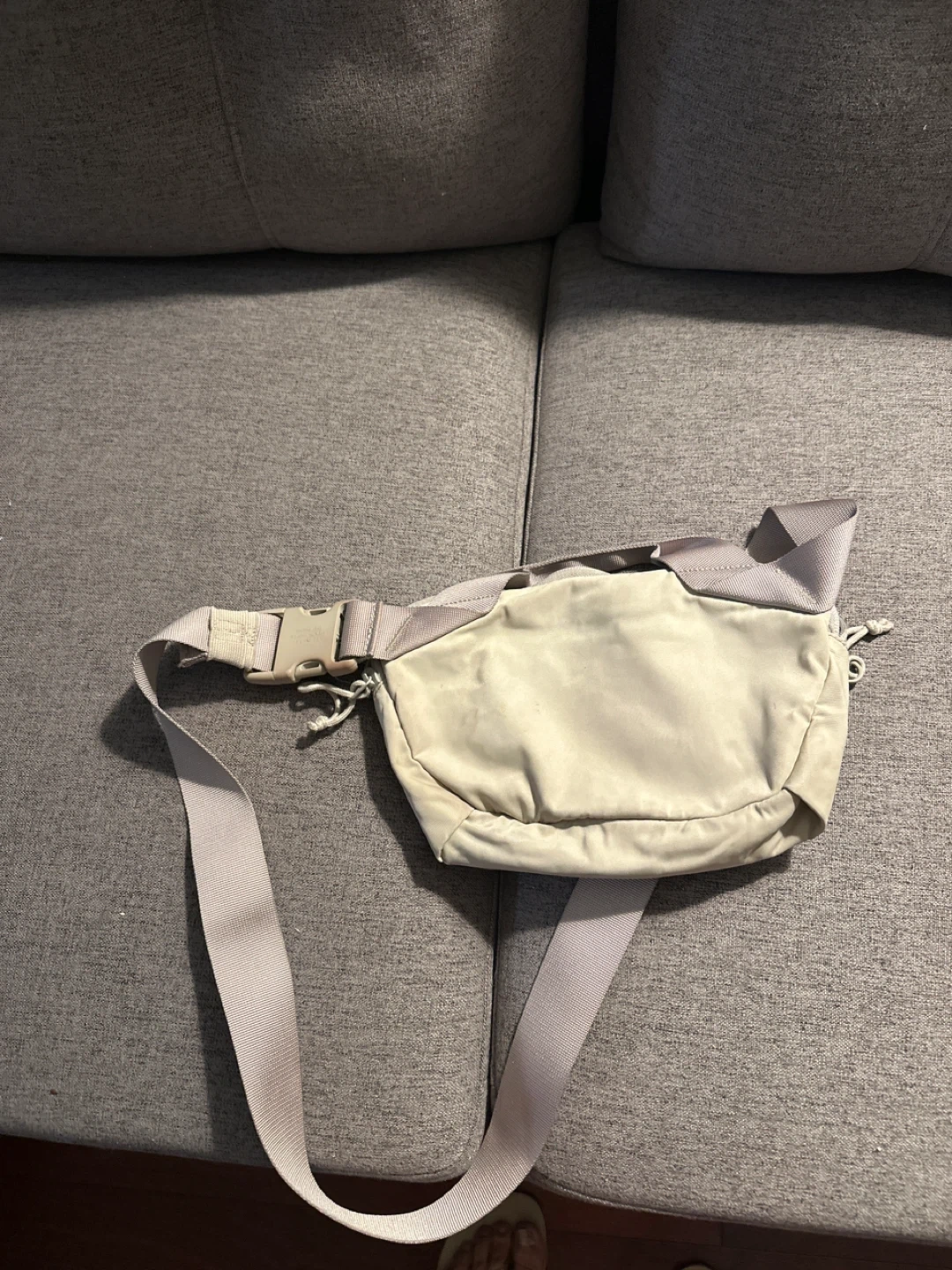 This is a Lululemon belt bag in a light beige colour. It has multiple zippered compartments and an adjustable strap. It's made of durable material and is great for carrying essentials on the go!