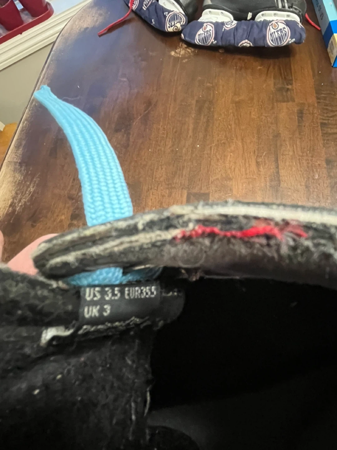 Youth hockey skates with blue laces. Size US 3.5, EUR 35.5, UK 3. These skates are good for beginner players. Blade guards are included.