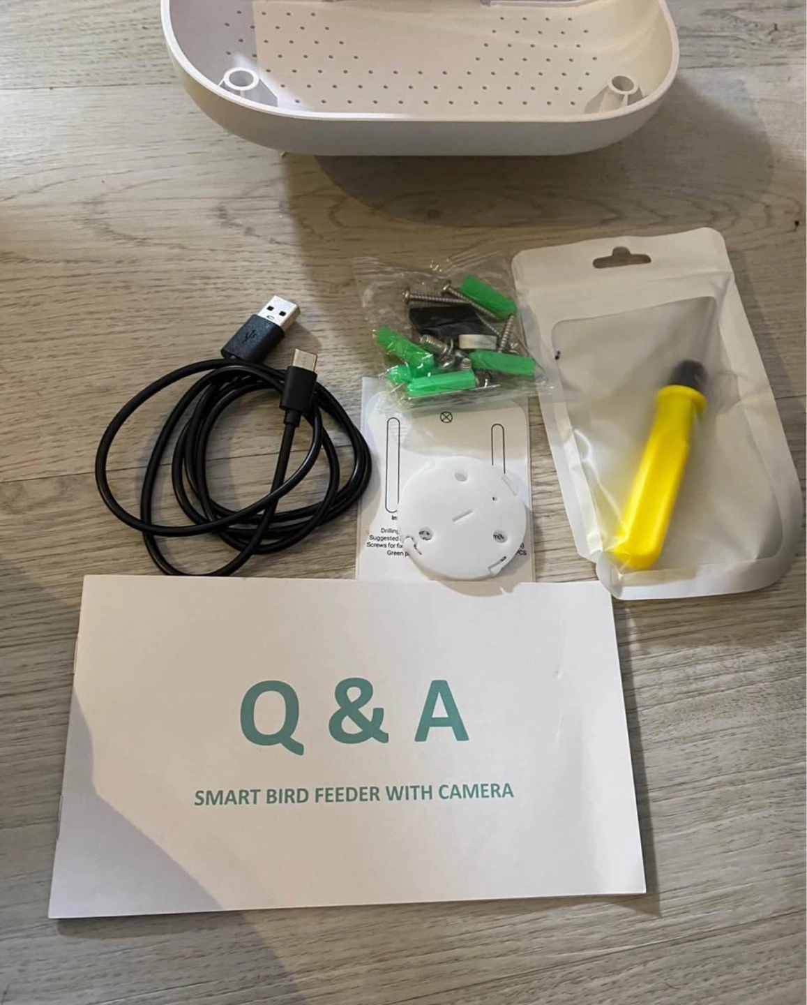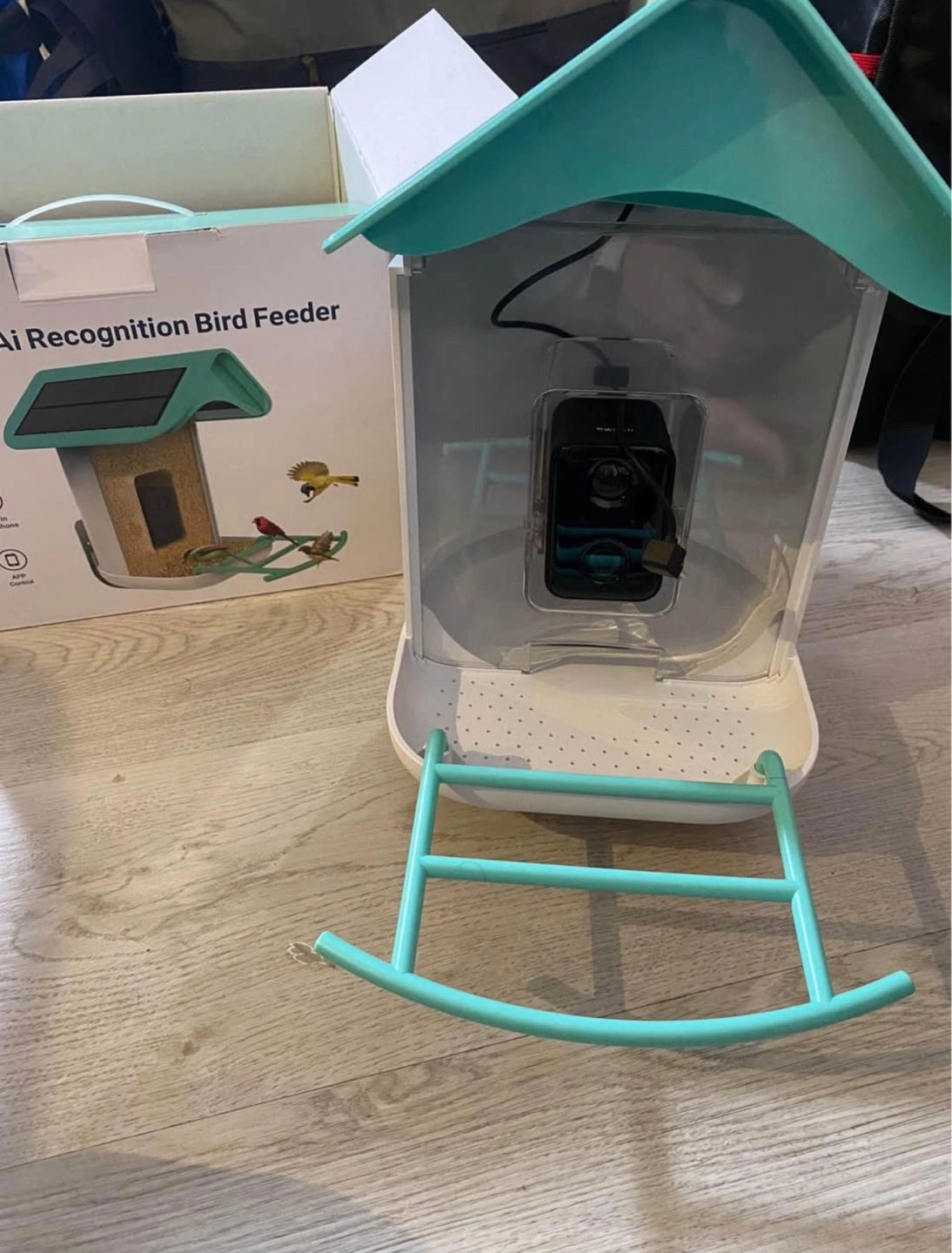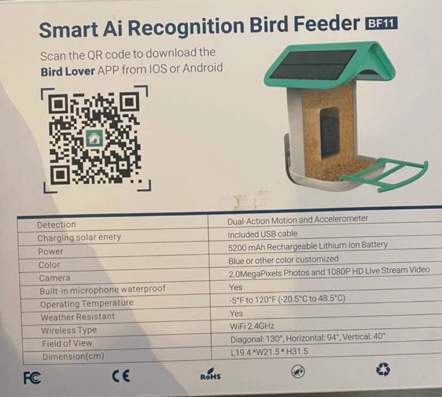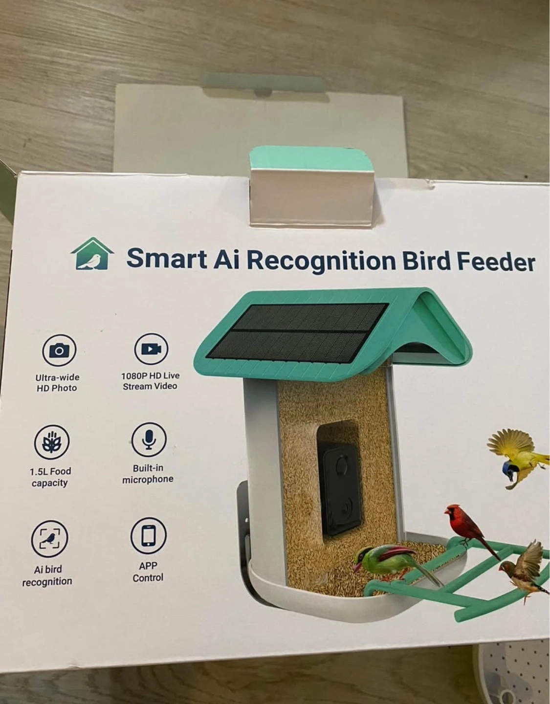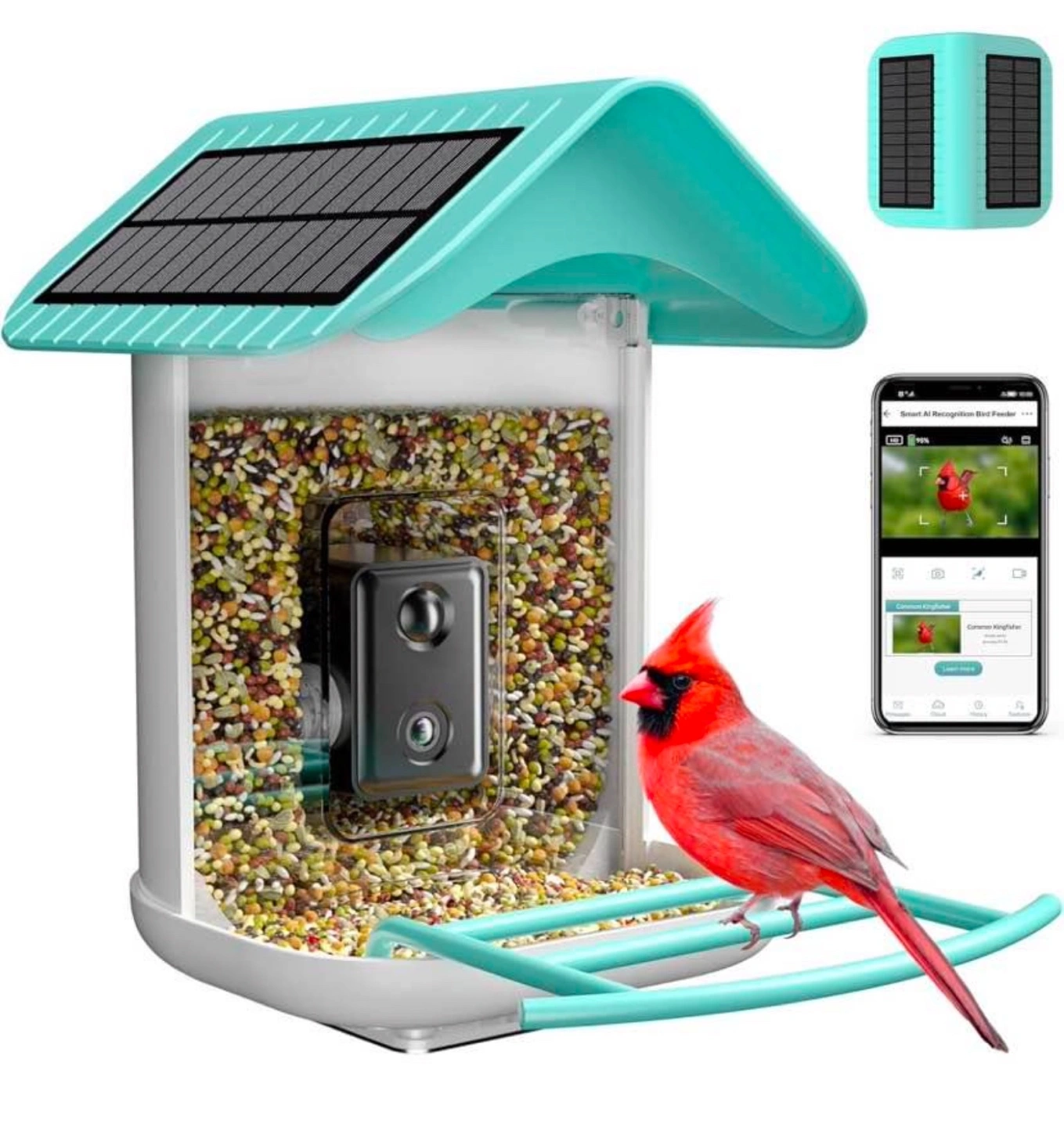 Solar powered bird feeder with built-in camera and AI bird recognition. Includes app control, 1080p HD live stream video, and ultra-wide HD photo capabilities. Water resistant and weather resistant. Easy to install.