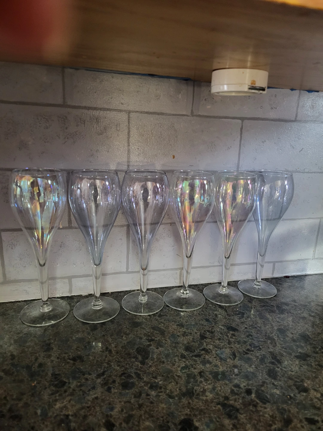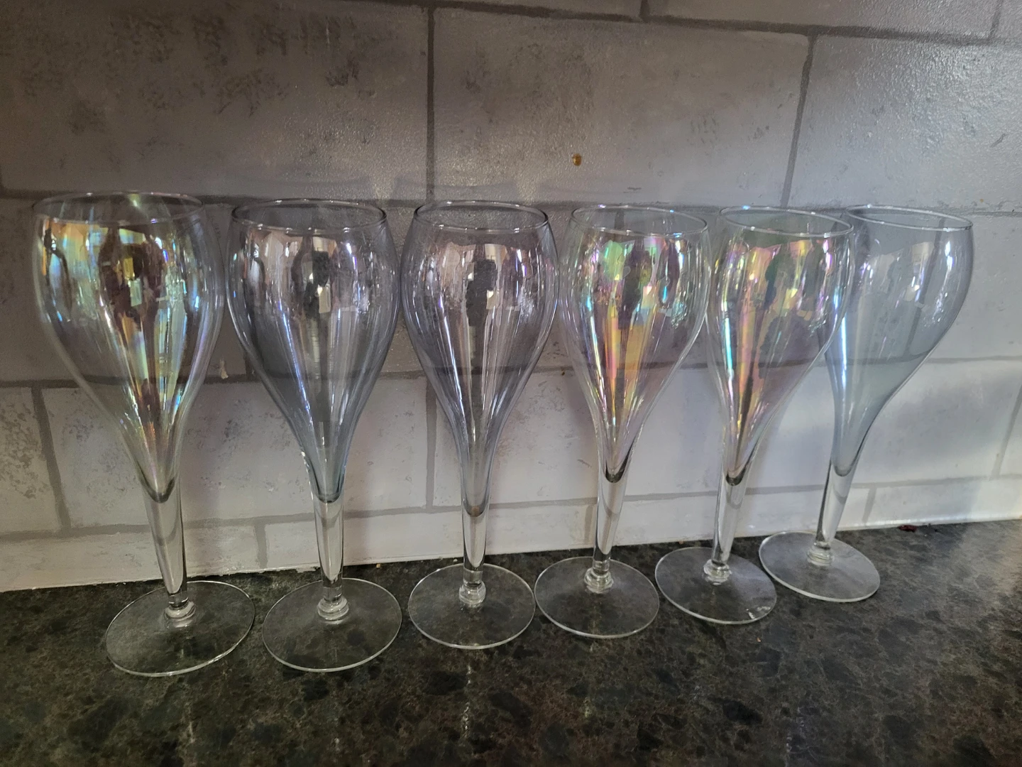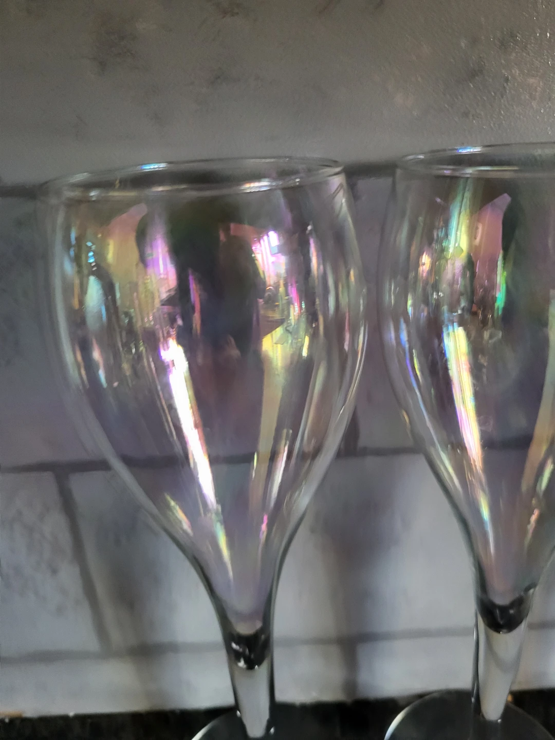 Selling a set of six champagne flute glasses. They have a unique iridescent finish that catches the light beautifully. Perfect for celebrations or adding a touch of elegance to your home bar.