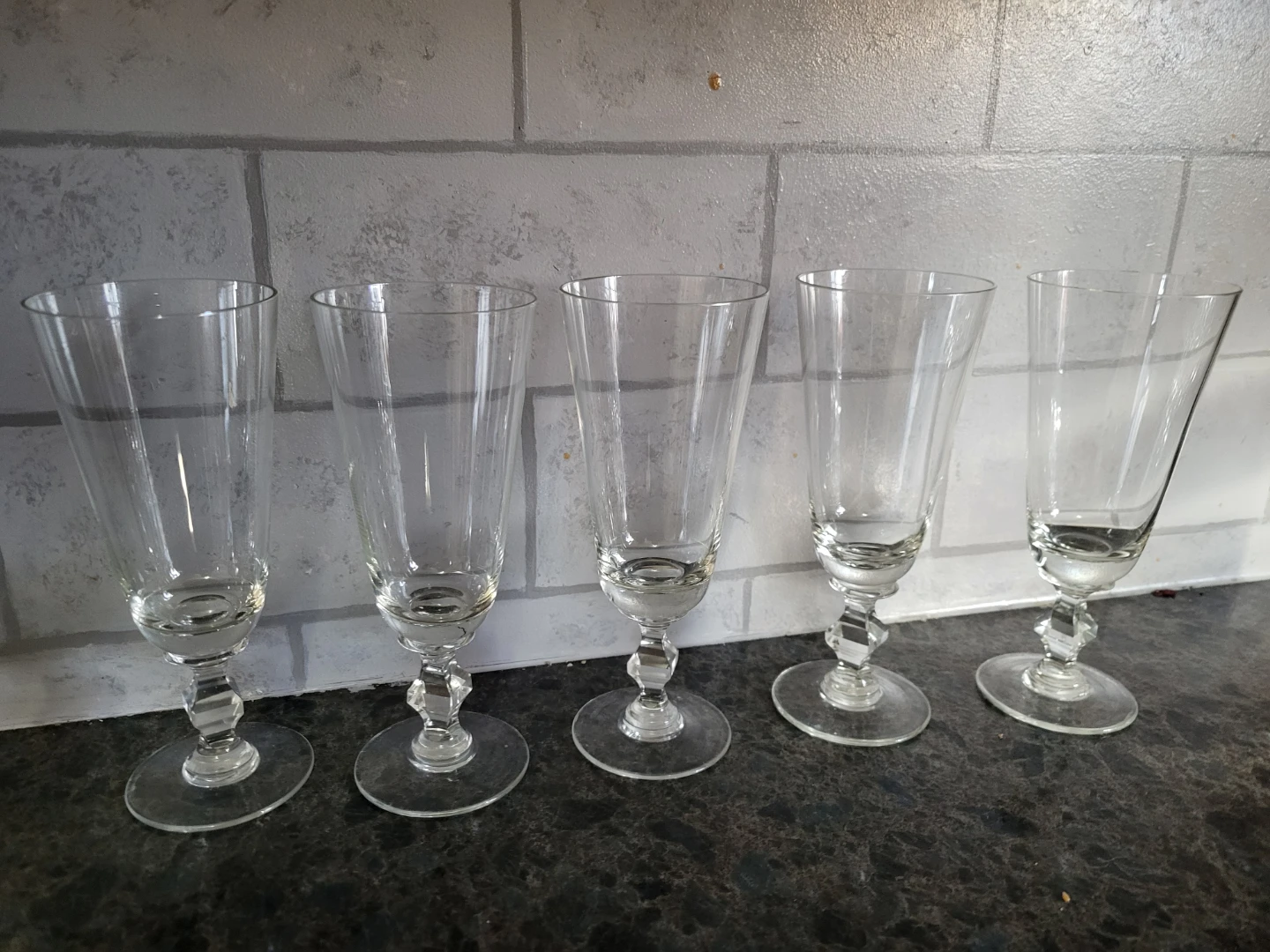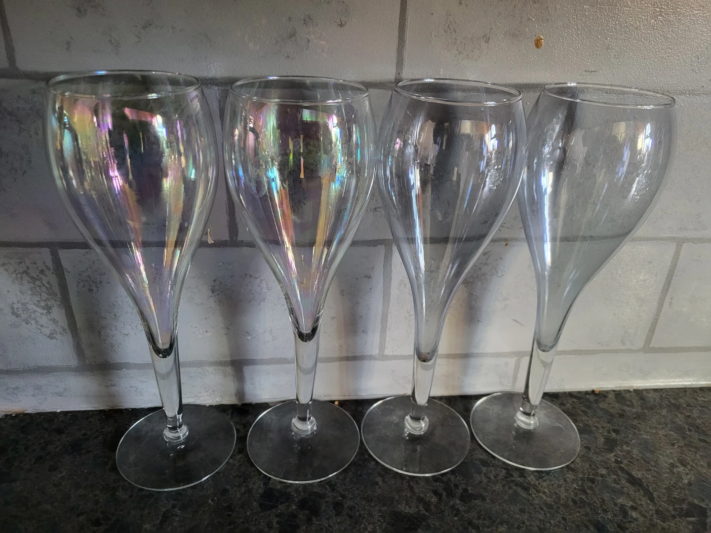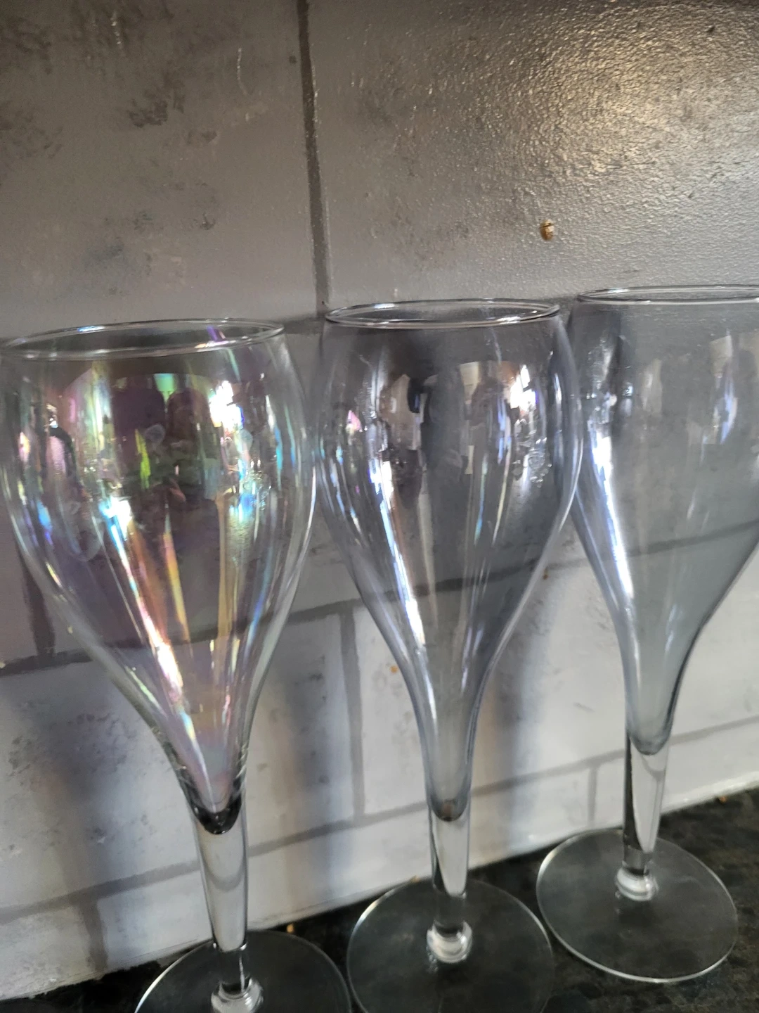 Selling a set of six champagne flute glasses. They have a unique iridescent finish that catches the light beautifully. Perfect for celebrations or adding a touch of elegance to your home bar.