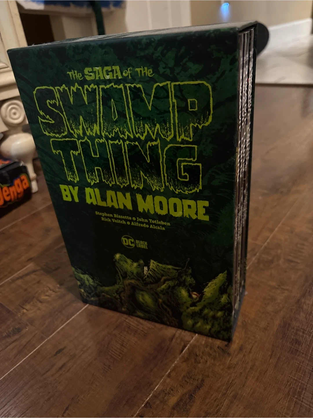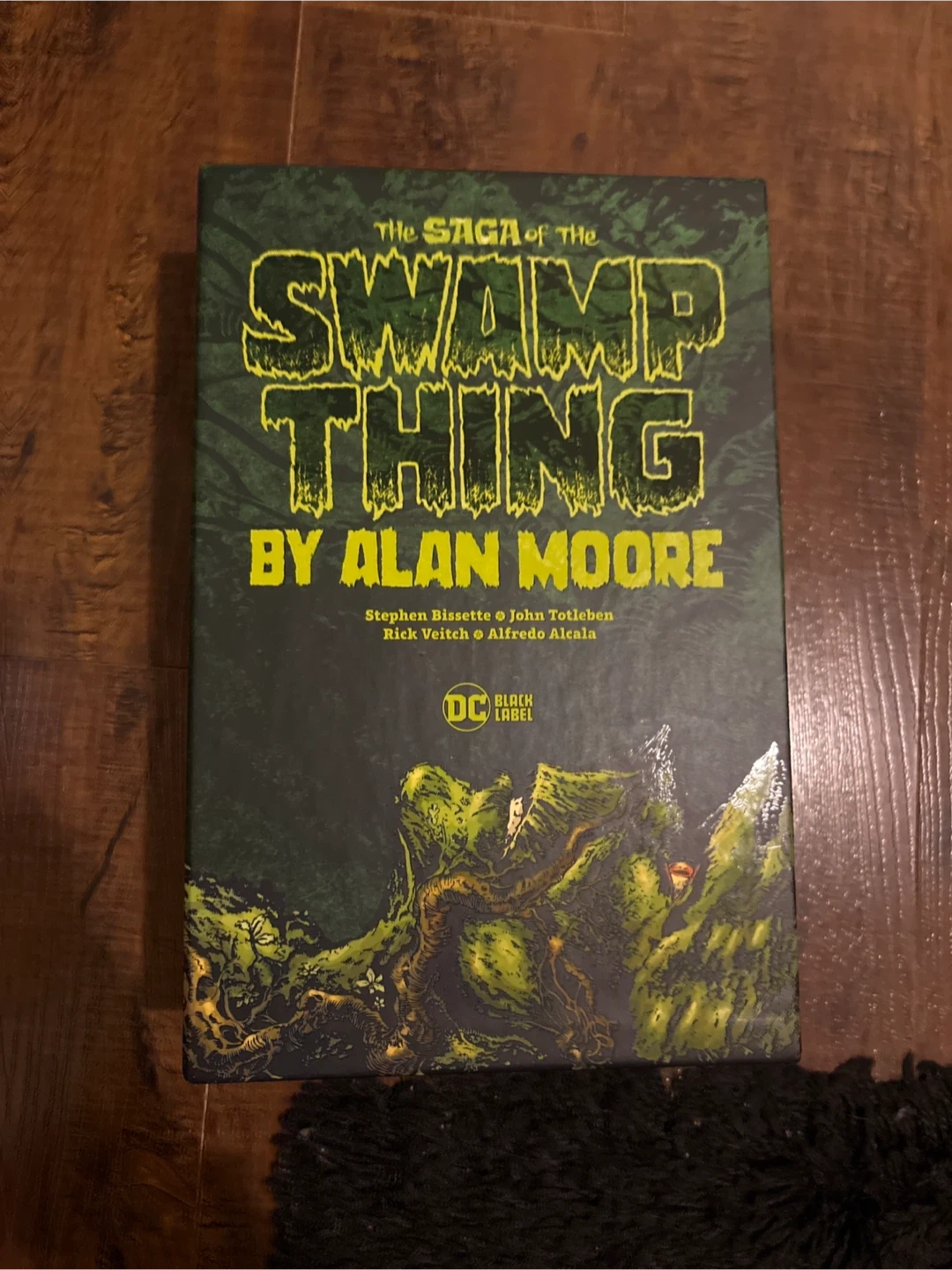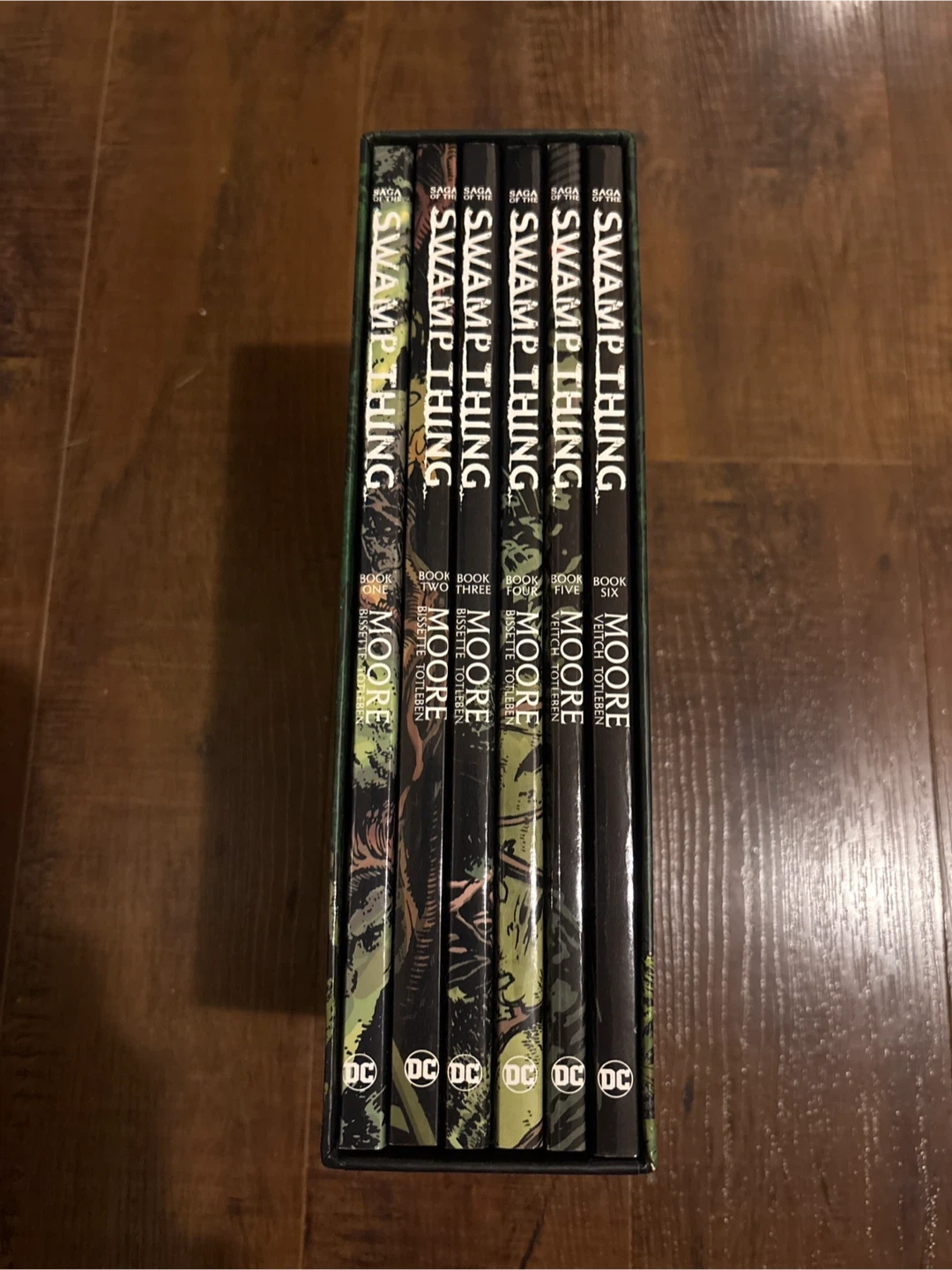 This is The Saga of the Swamp Thing by Alan Moore, a complete series box set from DC Black Label. It includes six books, featuring artwork by Stephen Bissette, John Totleben, Rick Veitch, and Alfredo Alcala. Great for any comic collector!