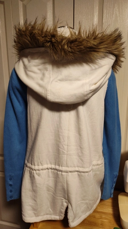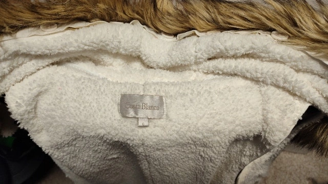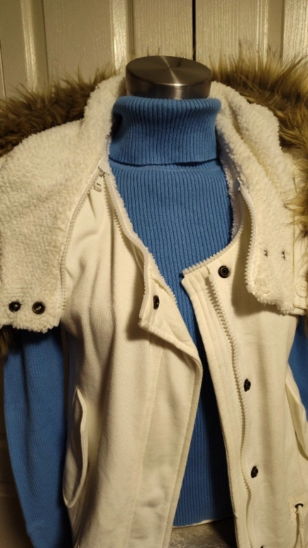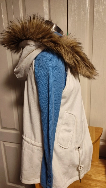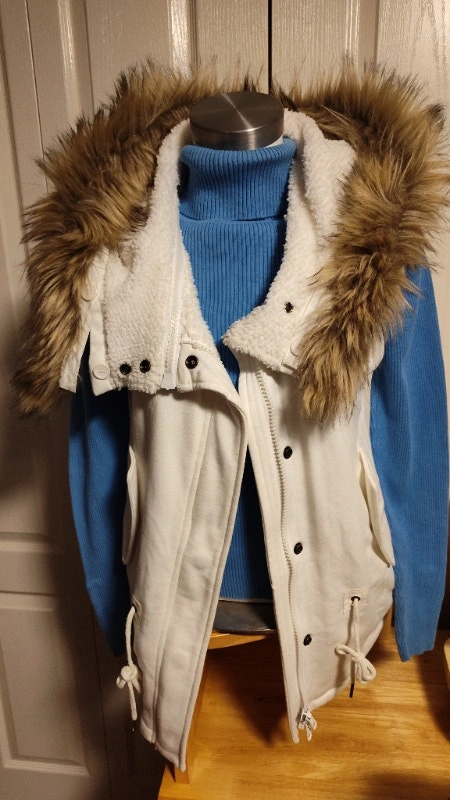 Never worn, this white vest has a removable hood and faux fur trim to customize style. It has a zipper closure, a waist drawstring, and pockets. Size medium. It has a warm faux sheepskin liner. I also have the same one in black in another ad. Asking $25 each, or best offer. Pick up in Mississauga near Britannia Rd and Ninth Line.