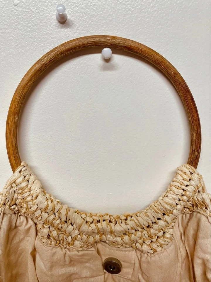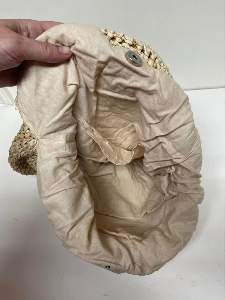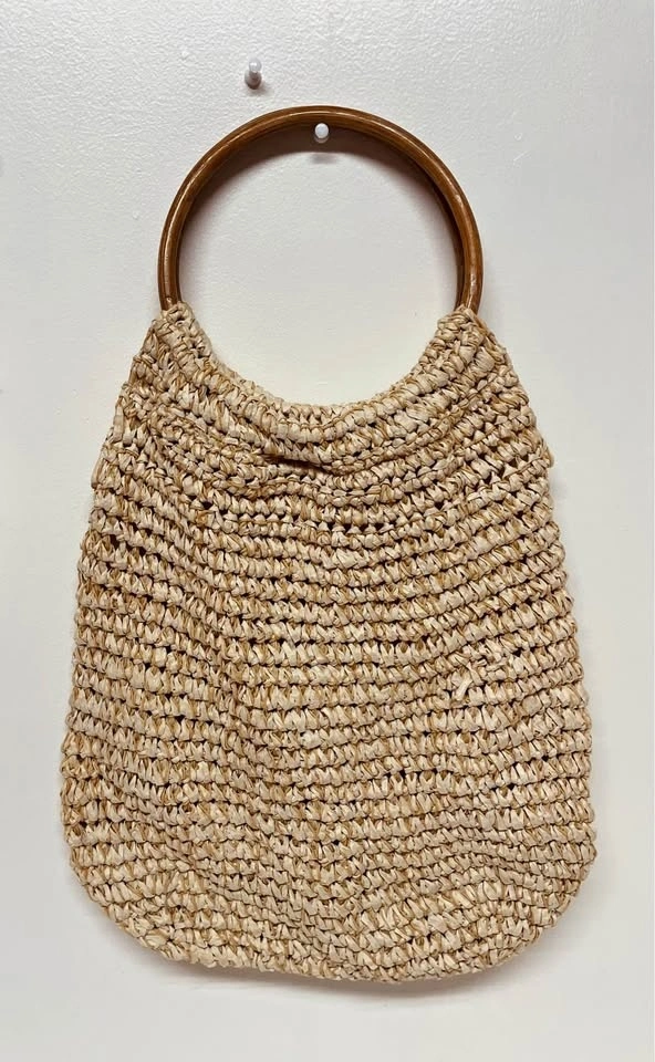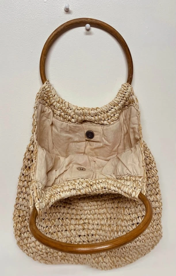 Clean, stain-free Blue Notes brand straw bag, perfect for summer. Features wood handles, one inside pocket, and a snap closure. Available for pickup in NW Regina. Measures 14” W x 20” H (including handles).