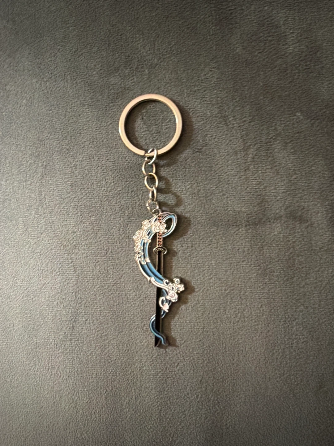 A decorative keychain featuring a blue wave and floral design, resembling a sword. It's made of metal with enamel accents. This accessory adds a unique touch to your keys or bag.