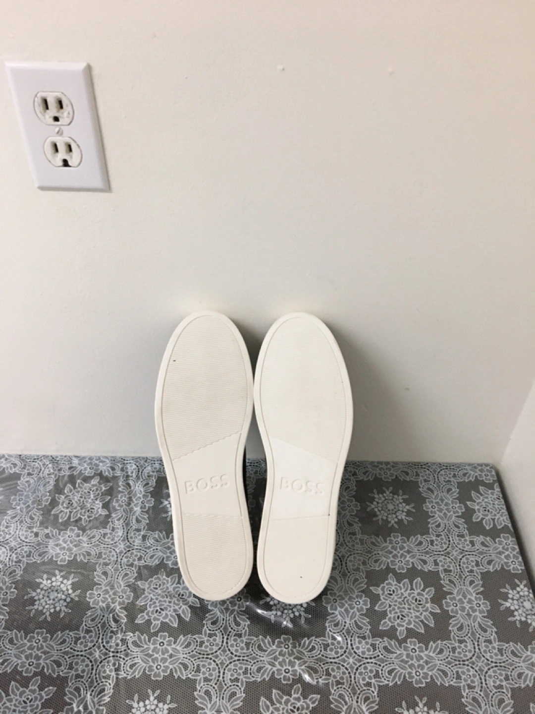 BOSS black low-top sneakers with white soles. Features subtle gold accent on the side and BOSS branding on the heel and sole. These are comfortable for everyday wear. Pick up at steeles and Bathurst cash only