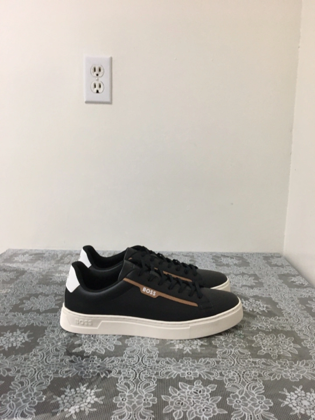 BOSS black low-top sneakers with white soles. Features subtle gold accent on the side and BOSS branding on the heel and sole. These are comfortable for everyday wear. Pick up at steeles and Bathurst cash only