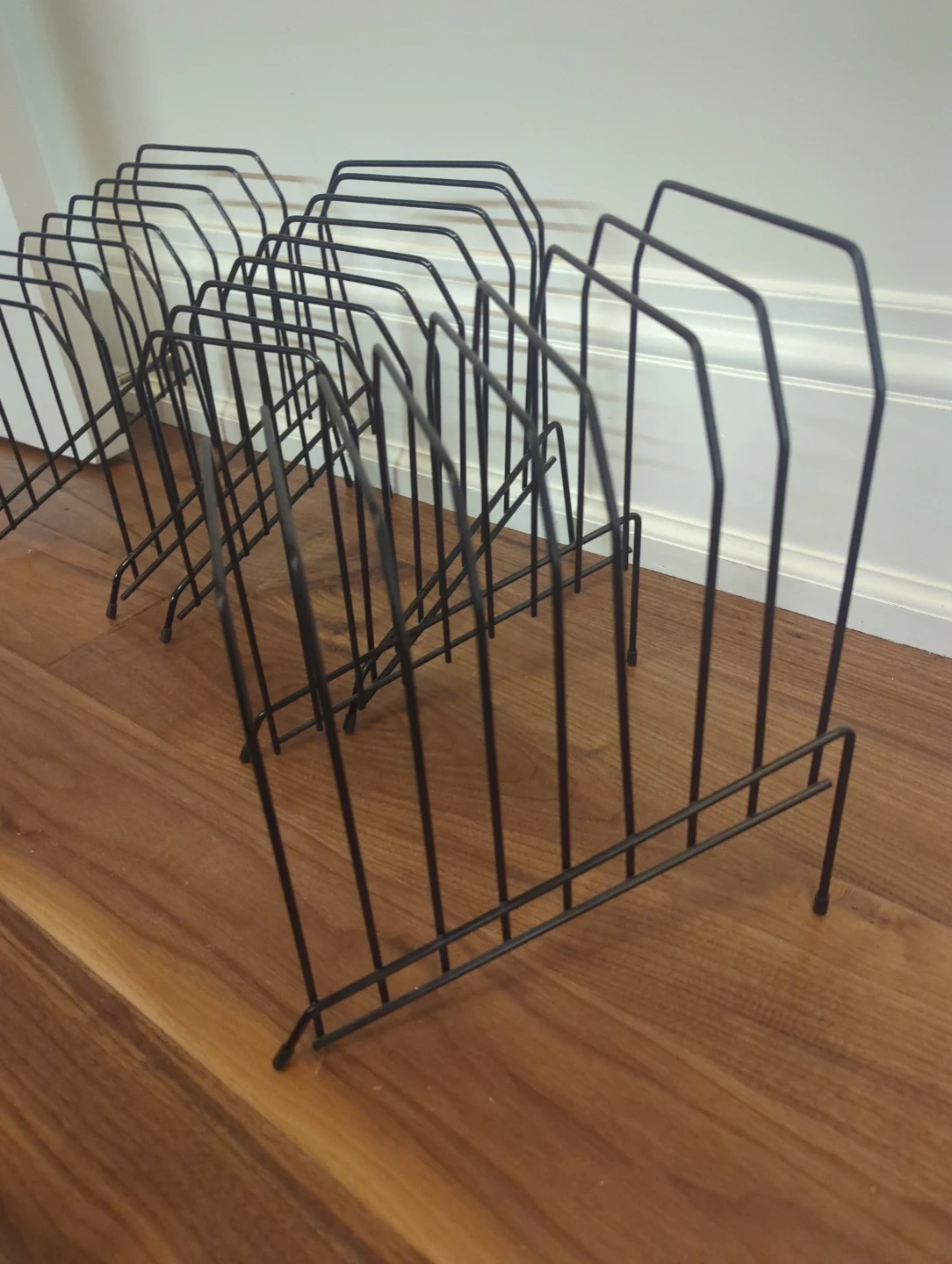 $5 each - 3 black wire holders, perfect for organizing magazines or files. They're made of durable metal wire with a simple, sturdy design. These holders would be useful for keeping any desk or bookshelf tidy!