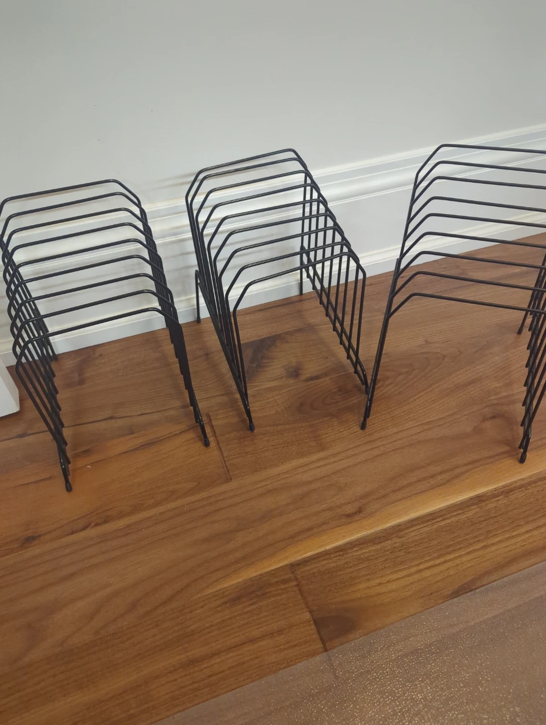 $5 each - 3 black wire holders, perfect for organizing magazines or files. They're made of durable metal wire with a simple, sturdy design. These holders would be useful for keeping any desk or bookshelf tidy!