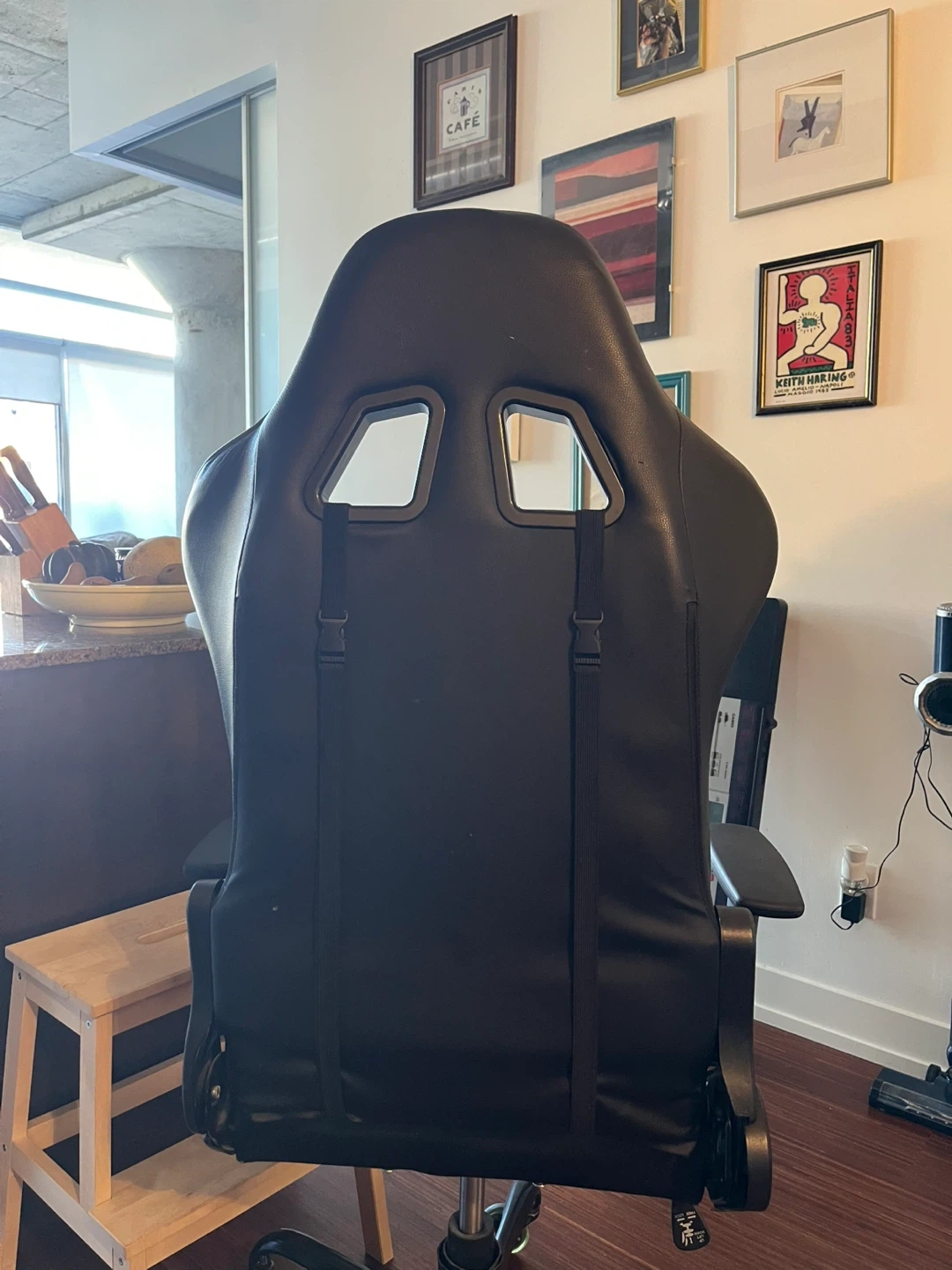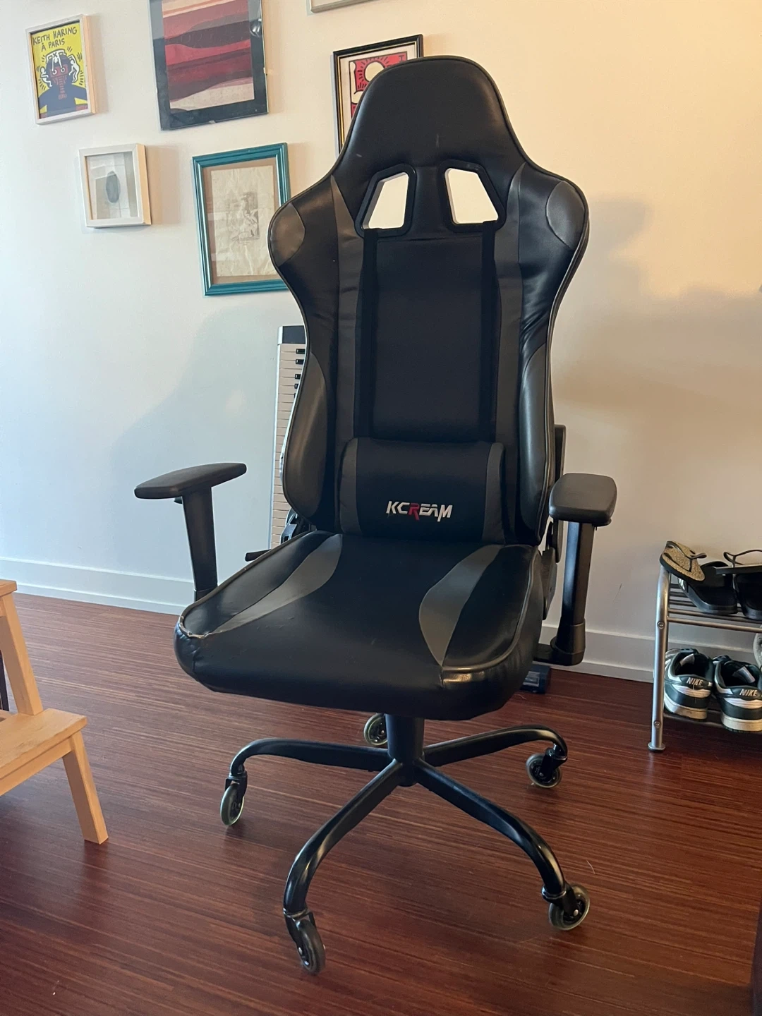 Selling a black KCream gaming chair. It has a few signs of wear and tear, as shown in the photos, but it's still very comfortable and functional. Perfect for long gaming sessions or working from home!