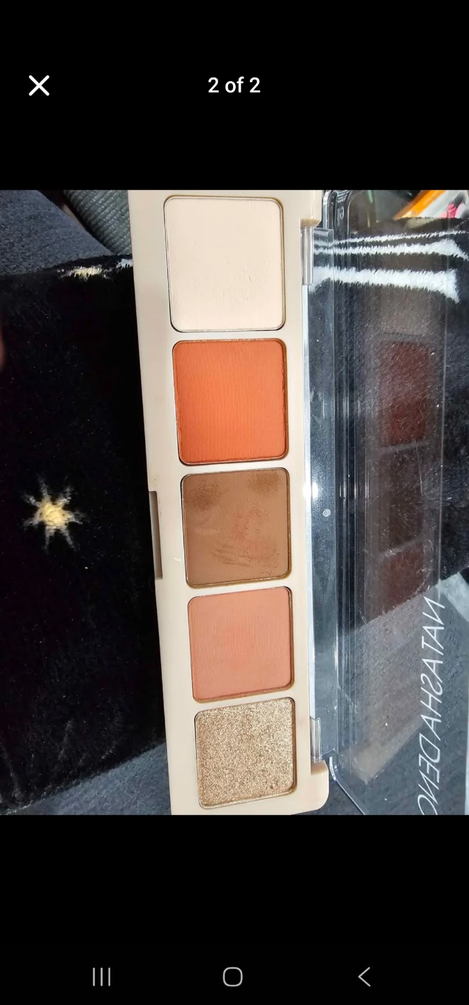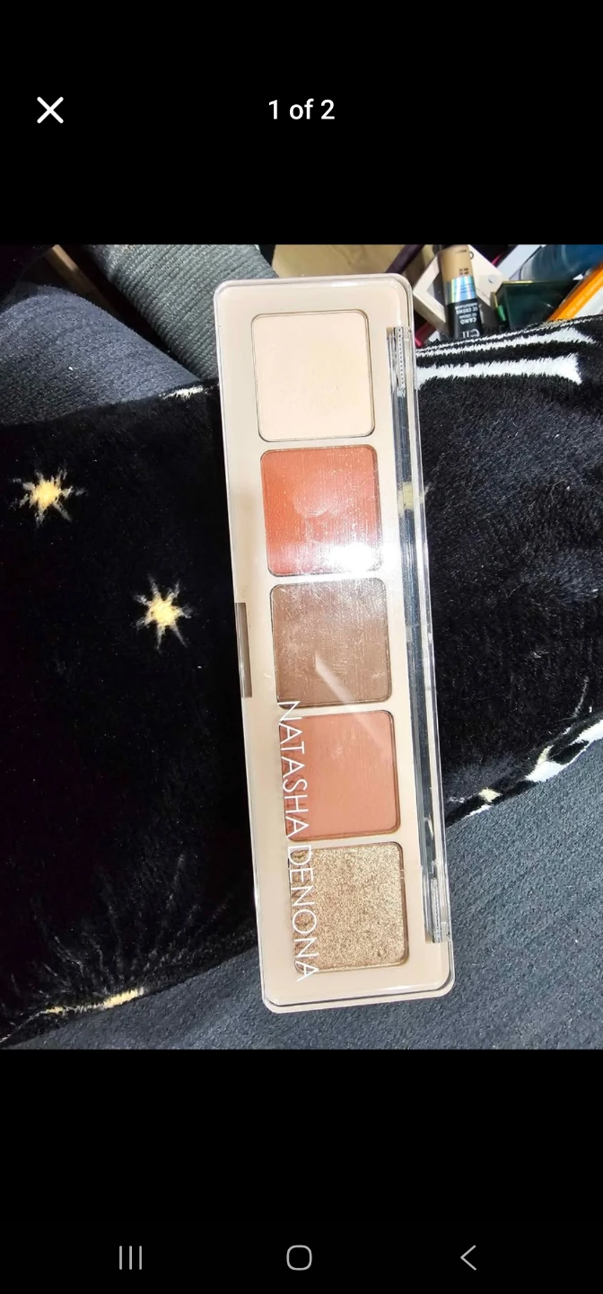This is a Natasha Denona eyeshadow palette with five shades. It includes a creamy matte base, a vibrant coral, a warm brown, a soft peachy nude, and a shimmering champagne glitter. These shades are designed for versatile looks!