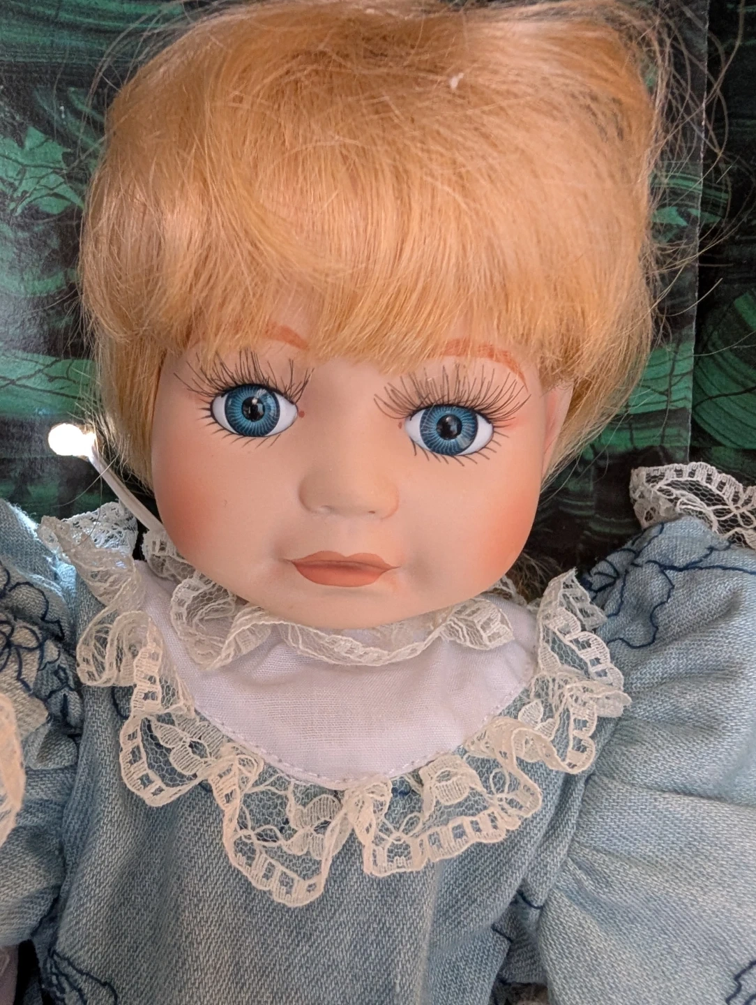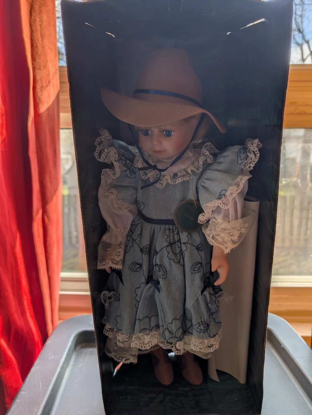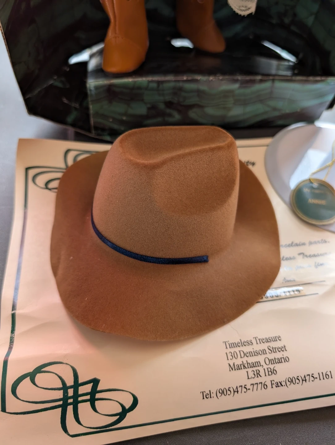 This is the Annie doll from Timeless Treasures. It's crafted from fine porcelain parts. The doll wears a blue dress and comes with a cowboy hat and boots.