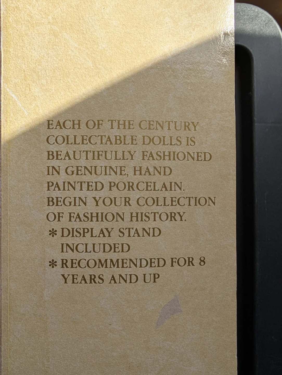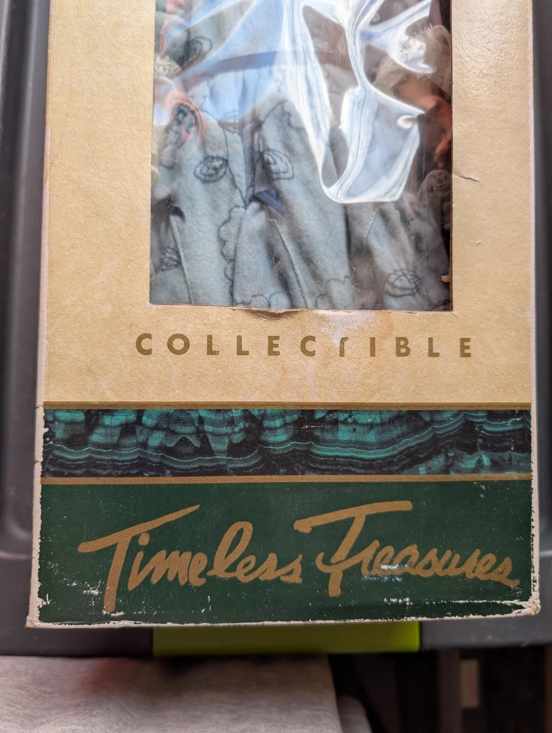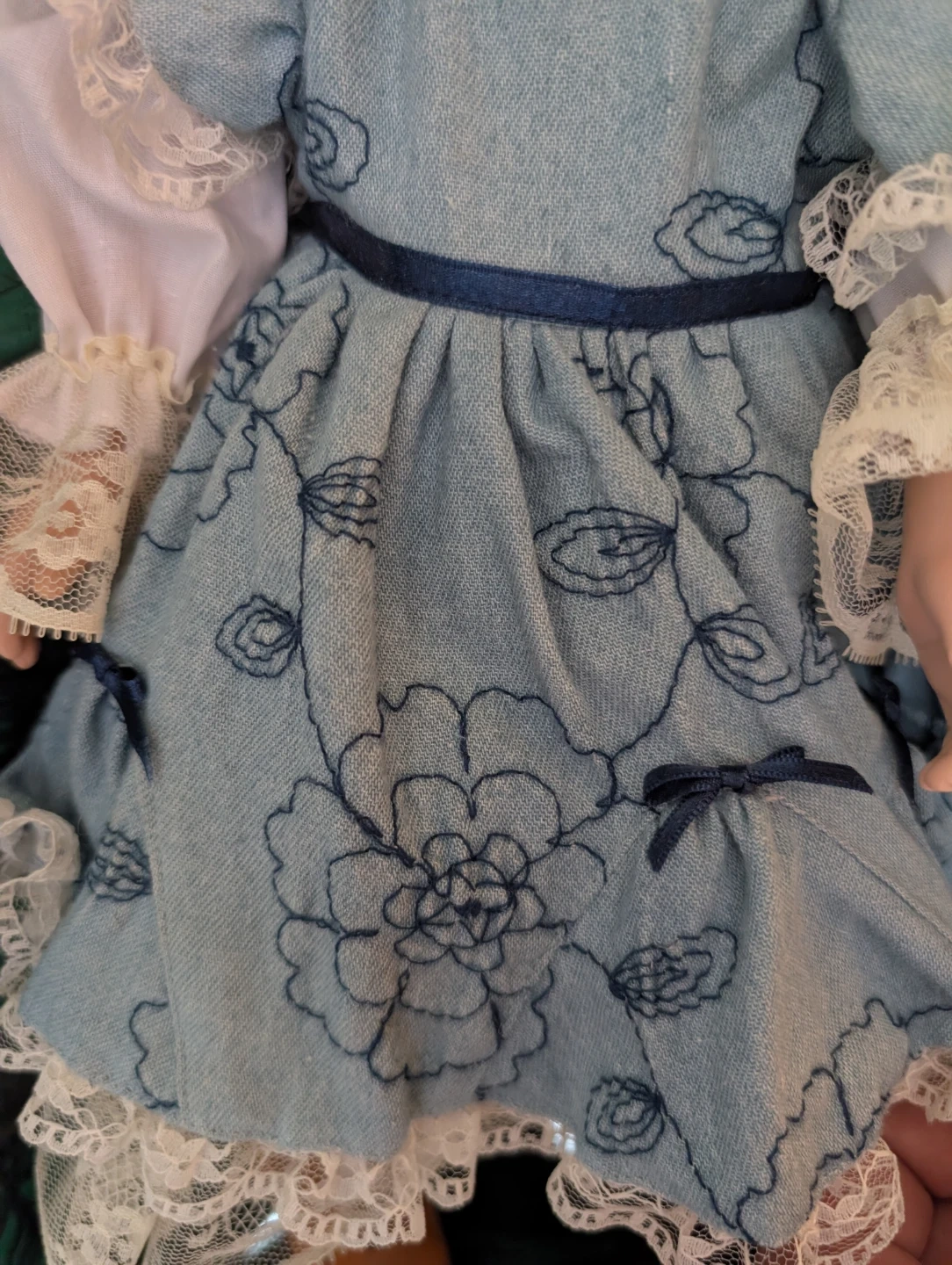 This is the Annie doll from Timeless Treasures. It's crafted from fine porcelain parts. The doll wears a blue dress and comes with a cowboy hat and boots.