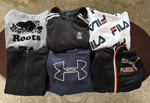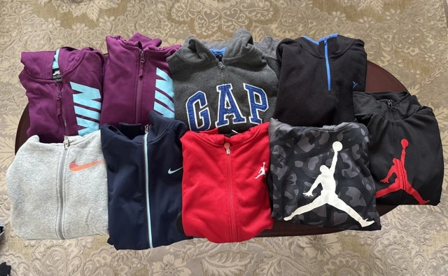 Purple Nike SB M (10-12) and L (12-13). GAP gray fleece L (10). Old Navy black XL (14-16). Nike gray M. Nike navy zip up XL. Nike Air Jordan red therma-fit hoodie L (12-13). Nike Air Jordan gray camo therma-fit hoodie M (10-12). Nike Air Jordan black zip up S. Roots kids hoodie XXL (13-14). Adidas Star Wars M (11-12). Fila XL (14-16). Cat & Jack black hoodie XL (16). Under Armour Navy Coldgear hoodie YLG. Puma black and orange zip up hoodie L (14-16).