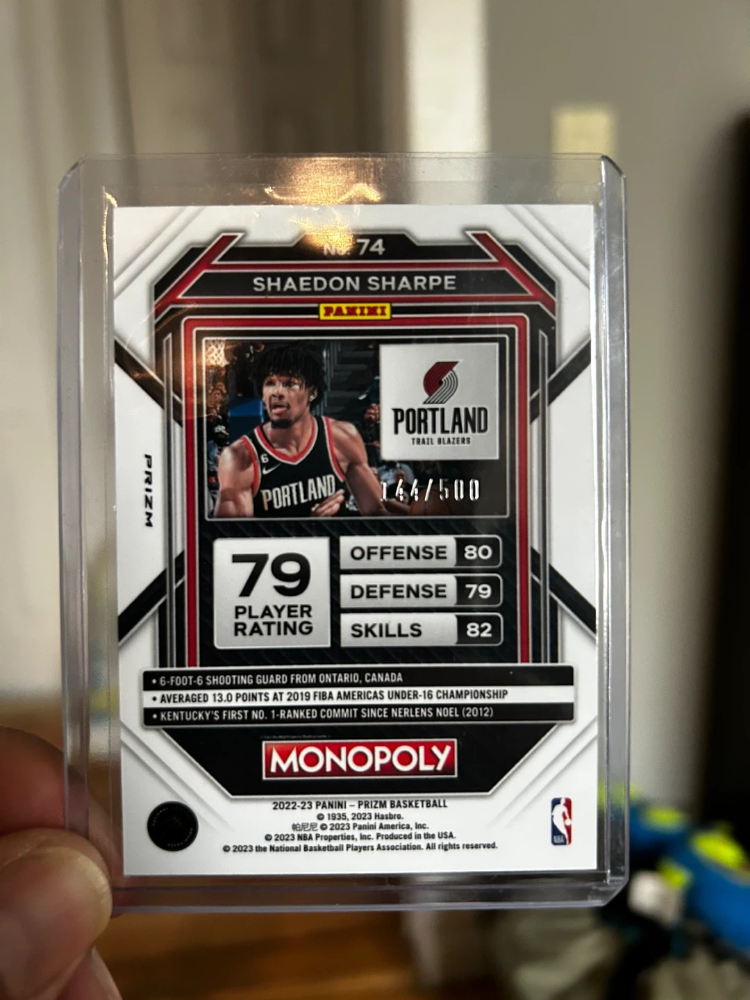 This is a 2022-23 Panini Prizm Monopoly basketball card featuring Shaedon Sharpe. It's serial numbered 144 out of 500. The card shows his player rating for offense, defense, and skills.