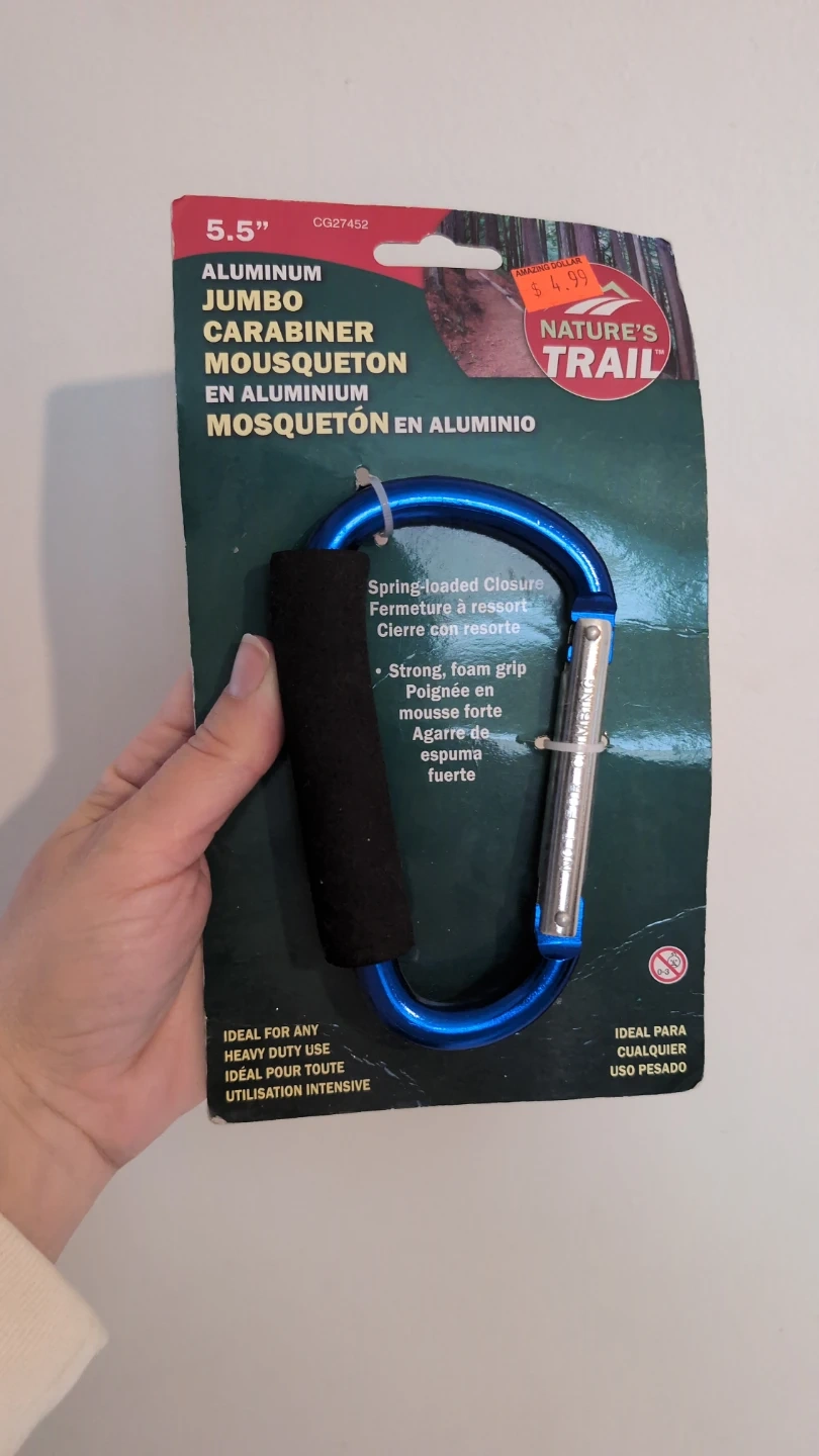 This Nature's Trail jumbo carabiner is made of aluminum. It's 5.5" in size and features a spring-loaded closure and a strong, foam grip. This carabiner is ideal for any heavy-duty use.