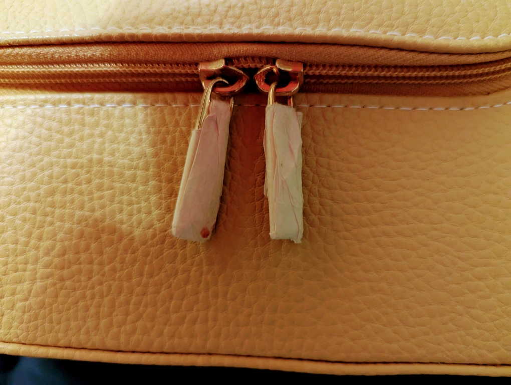 Mustard yellow cosmetic case. Zipper closure. Top handle. Interior lining. Made in China.