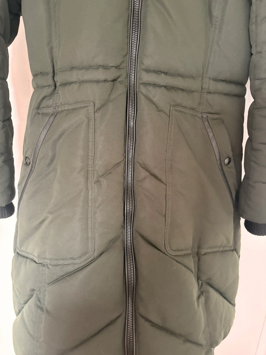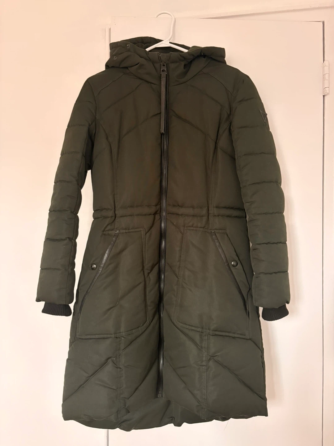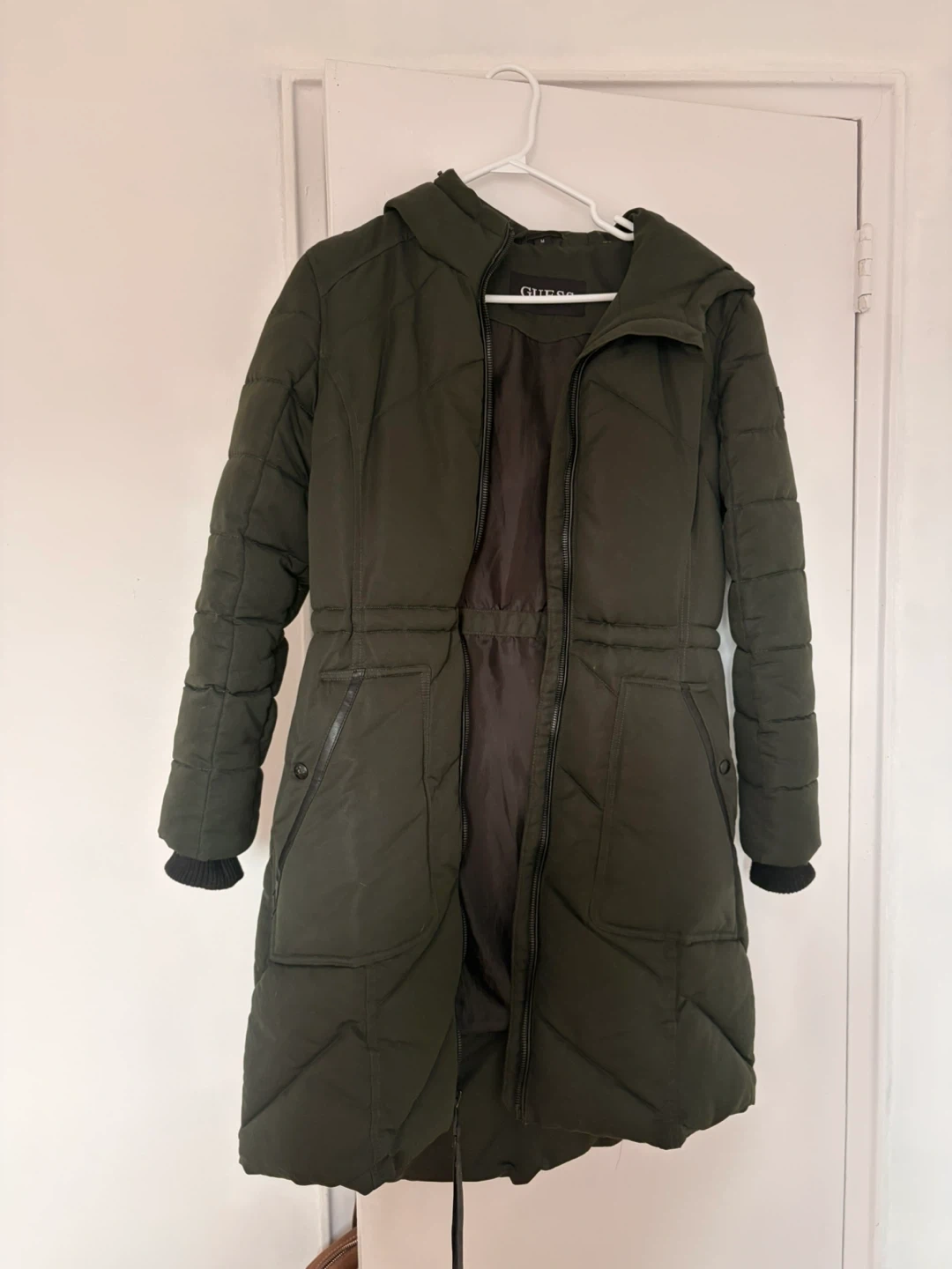 Long olive green winter coat from Guess. Very warm and great for Canadian winters.