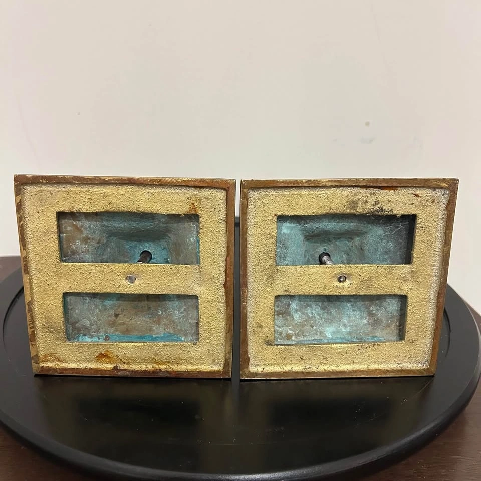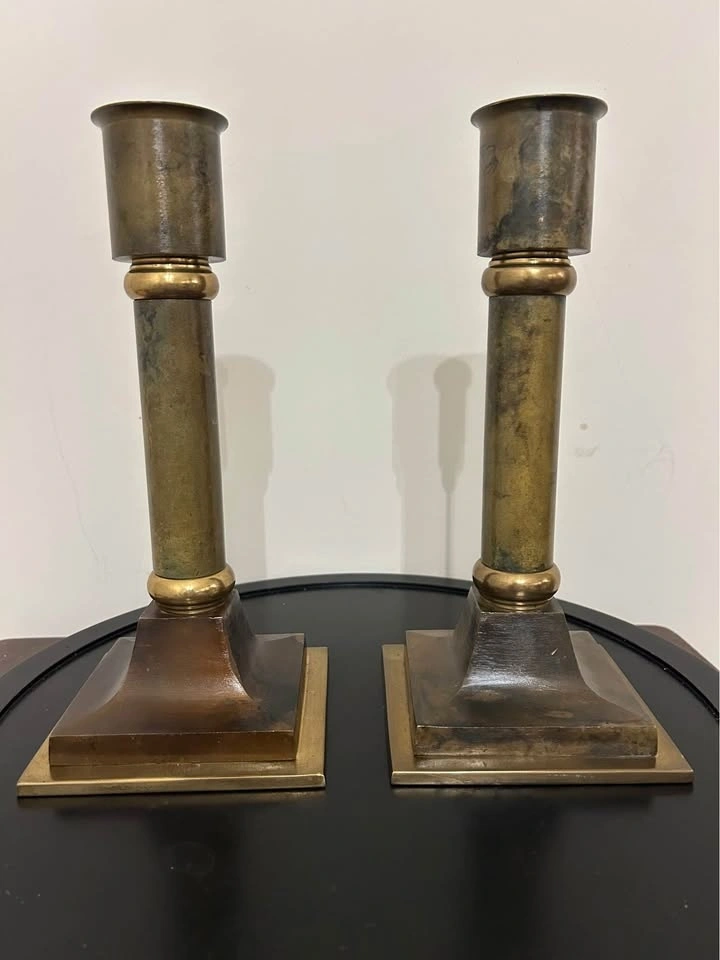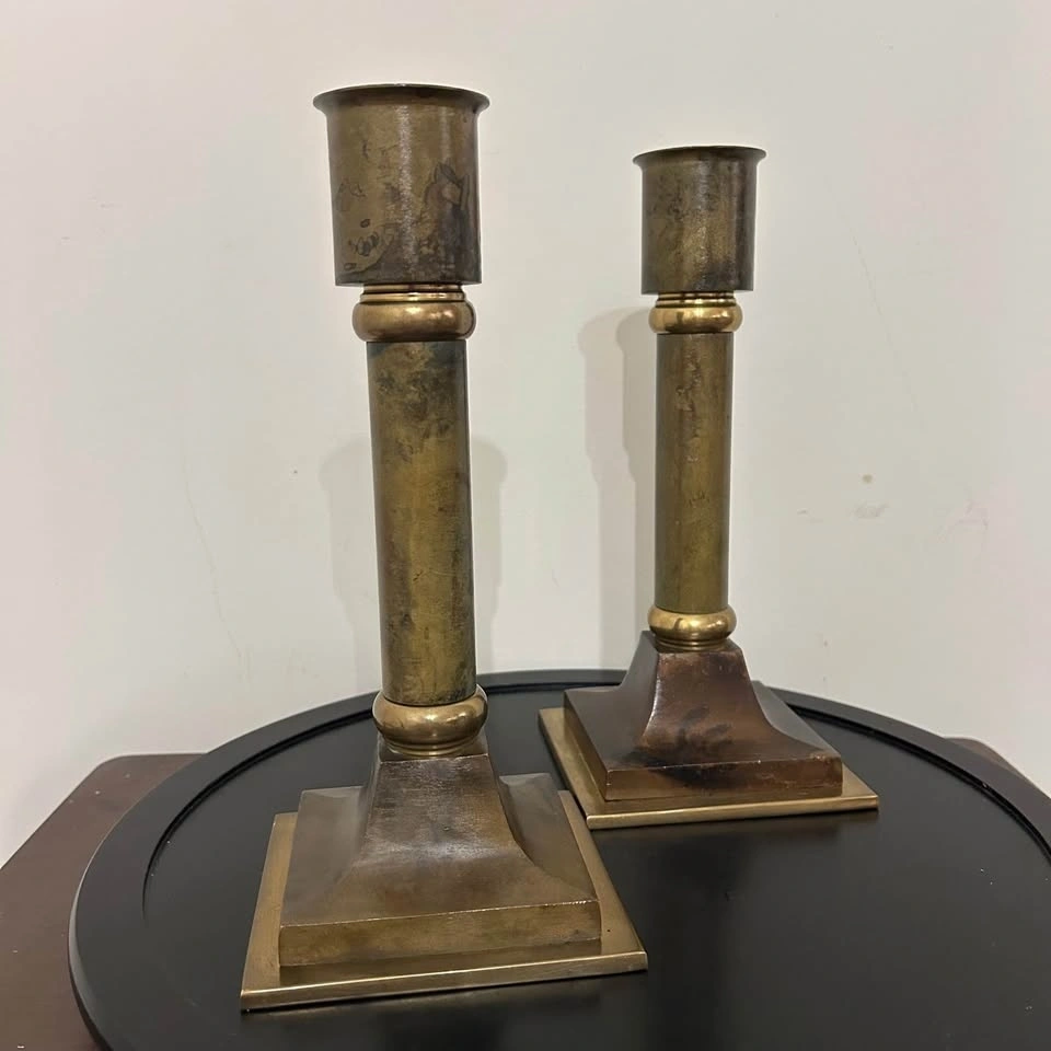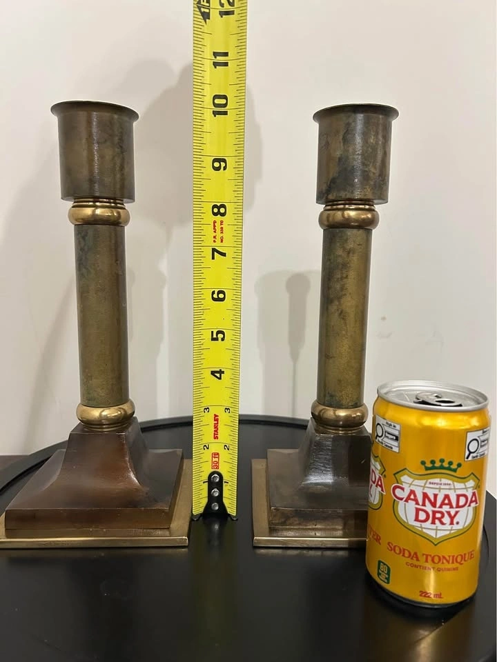 Striking pair of vintage solid brass altar-style candlesticks with a bold neoclassical column design. These are substantial, heavy pieces with excellent stability thanks to their wide, tiered square bases. The elegant proportions and architectural detailing give them a timeless presence, whether styled on a fireplace mantle, dining table, sideboard, or as part of a dramatic centerpiece. The brass has developed a rich, deep natural patina that highlights their authentic age and character. These are not lightweight modern reproductions — they have the weight, craftsmanship, and wear consistent with quality vintage brass. A refined decorative statement for traditional, ecclesiastical, or eclectic interiors. Pick up: Seton area, Calgary. Payment: cash. See also my other lots. Open to your questions and suggestions. If necessary, I provide additional photos. These are not new things, so please look carefully at the photos and videos. Measurements can be seen in the photos.