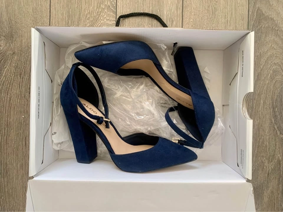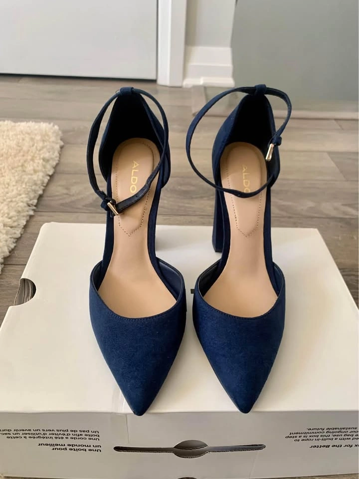 Brand new in box Aldo Heels. Navy Blue suede pointed toe block heels that buckle at the ankle. Original price: $120.00