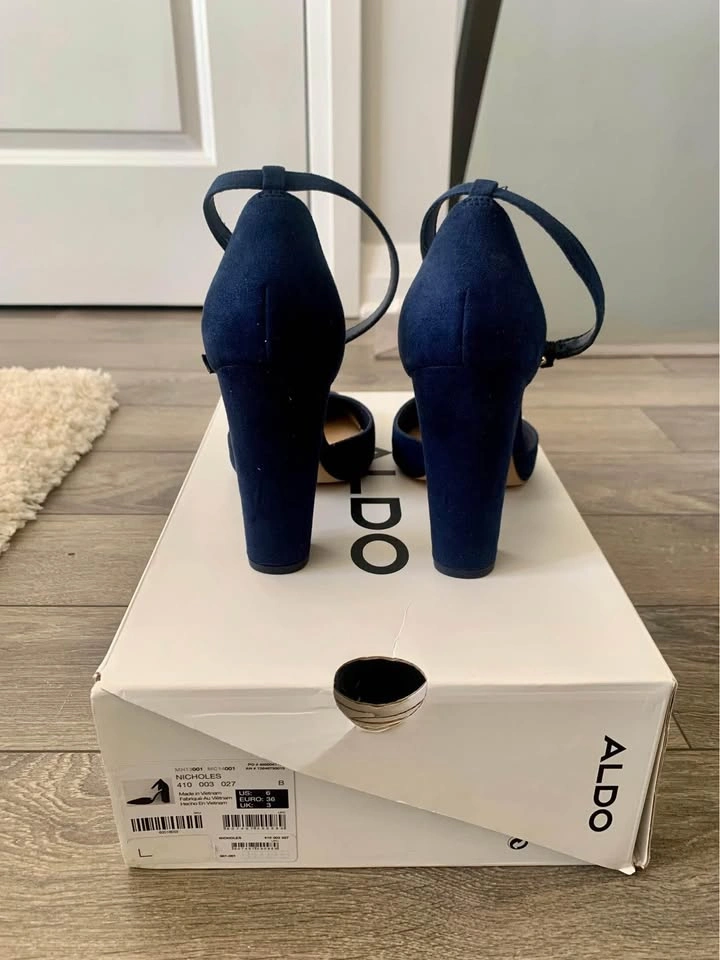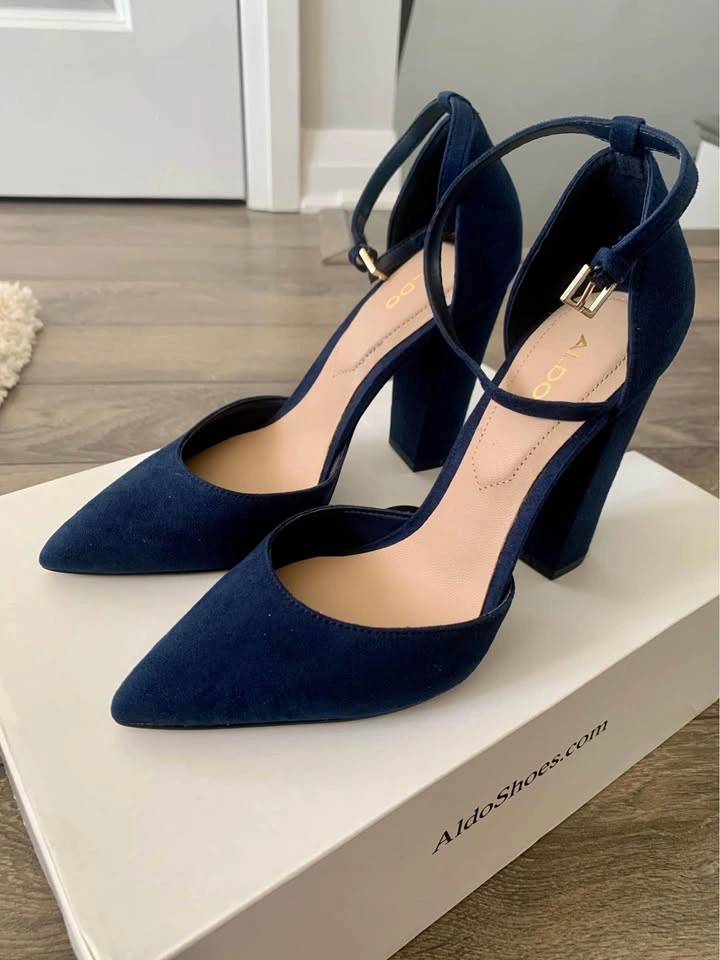 Brand new in box Aldo Heels. Navy Blue suede pointed toe block heels that buckle at the ankle. Original price: $120.00