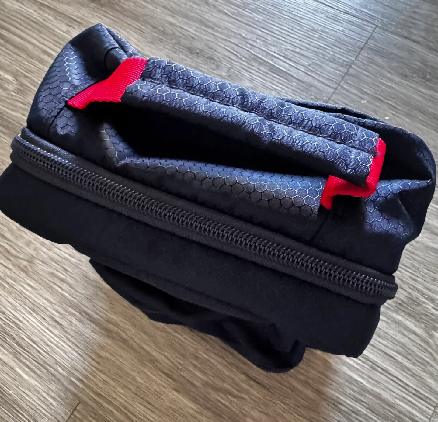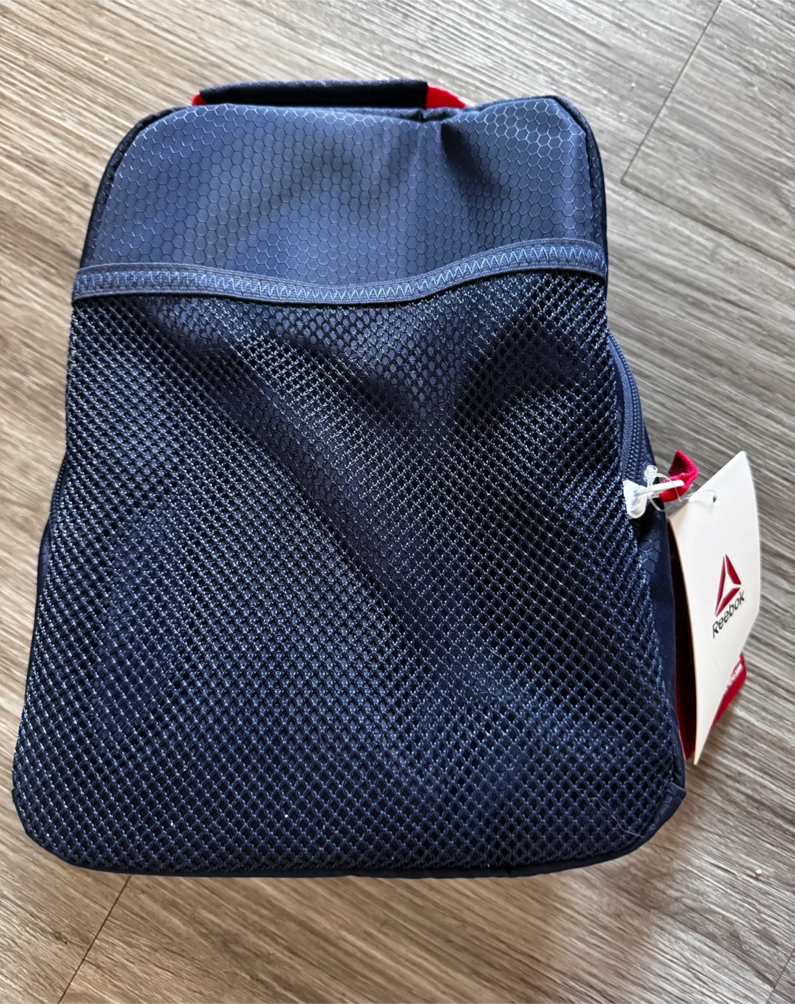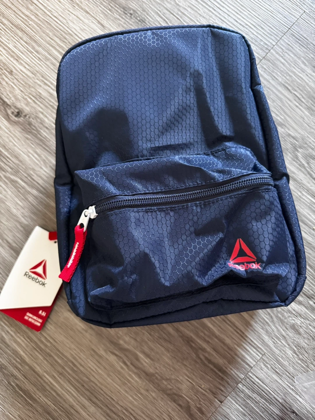This is a navy blue Reebok small backpack bag. It has a textured hexagonal pattern and a front zippered pocket. Features a mesh back panel and red zipper pull accents.