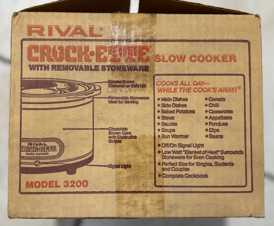 Used only once. Kept as new. Tested and working! With original box and manual. Vintage Rival Brown CROCK-ETTE 1 QUART Stoneware Slow Cooker Model 3200. This small 1 quart model is perfect for 1 or 2 people and gives an instant vintage look to any kitchen. Great for a gift or present for any occasion.