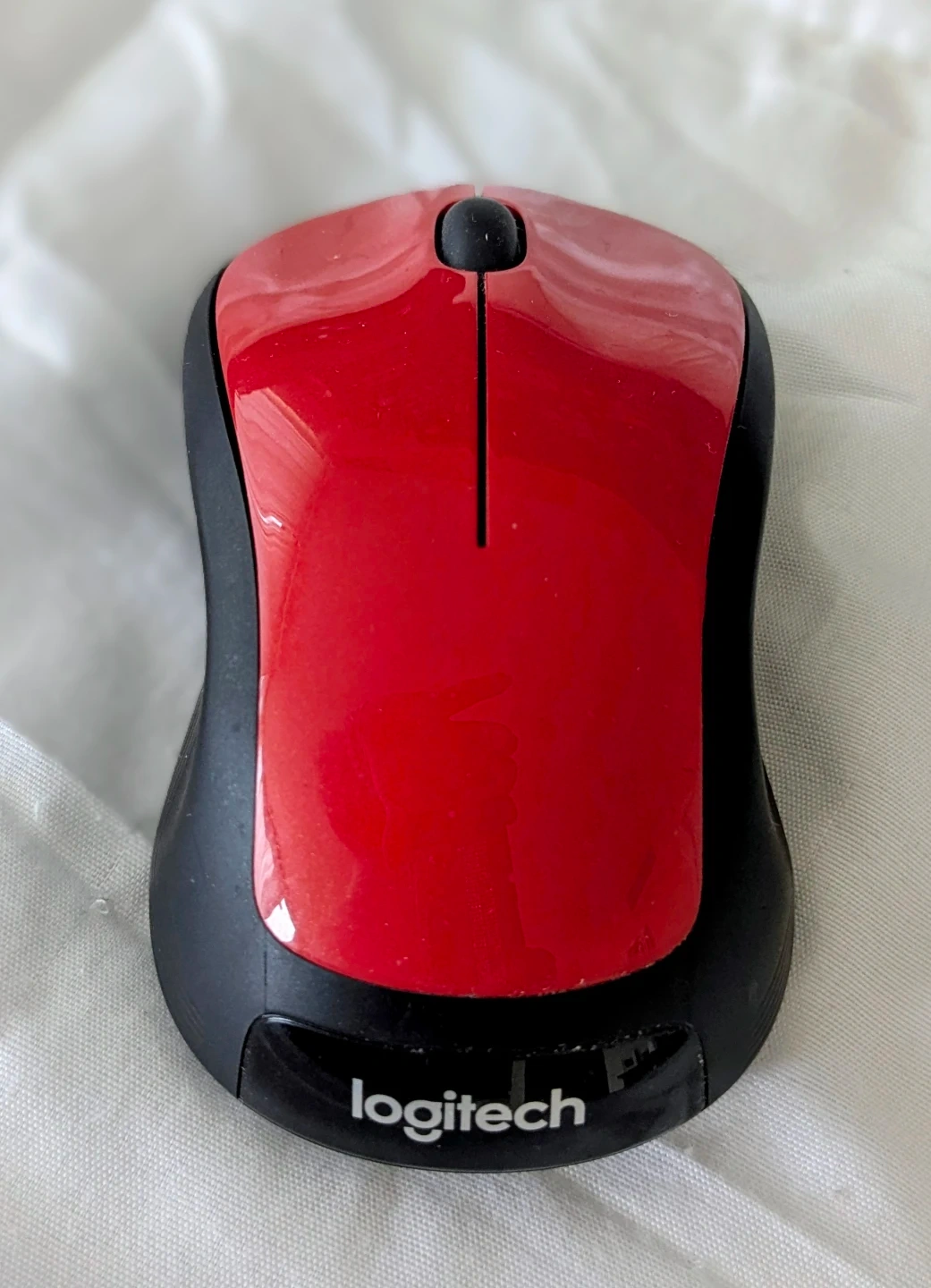 Compact Logitech wireless mouse in a vibrant red colour. It's a wireless optical mouse, perfect for everyday computer use.