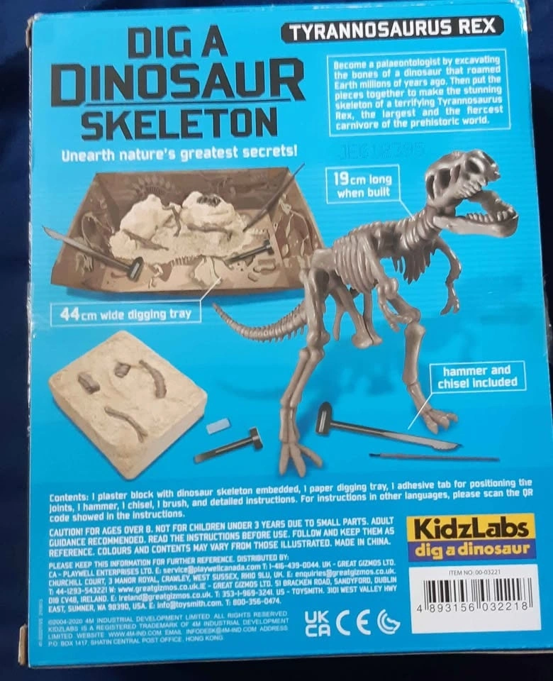 This is a 4M KidzLabs Dig A Dinosaur Skeleton Tyrannosaurus Rex excavation kit. The kit allows users to excavate a T-Rex skeleton from a plaster block using a specially designed digging tool. Once all the bones are excavated, they can be assembled into a model of a Tyrannosaurus Rex skeleton. The assembled model measures approximately 7.5 inches long (about 19 cm) and comes with a display platform. The kit is recommended for ages 8 and up, with adult supervision advised due to small parts.