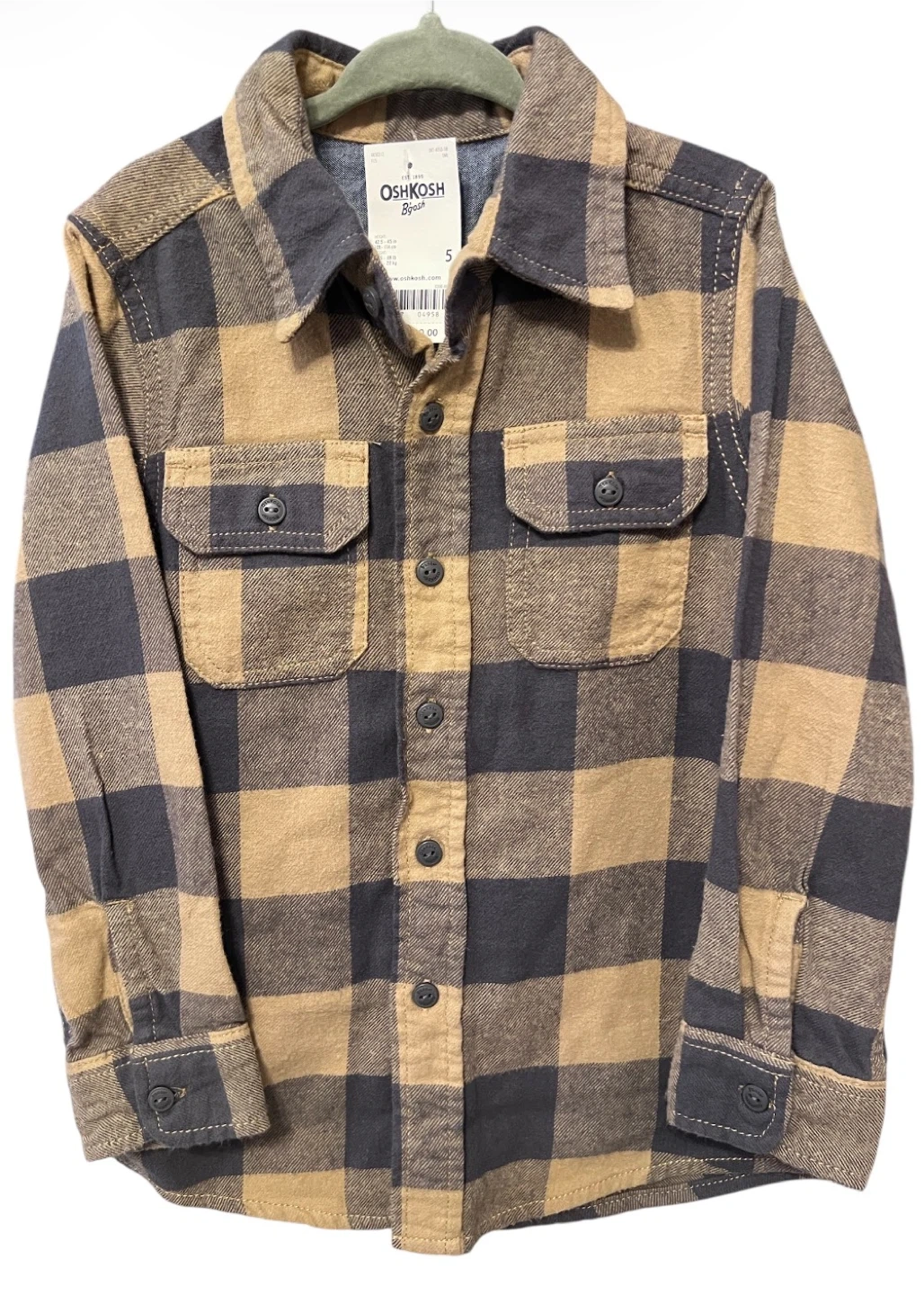 Brand new with tag! Cozy and stylish flannel shirt from OshKosh B’gosh in a tan and charcoal plaid pattern. Perfect for fall, winter, or layering. Quality, durable fabric with front pockets and a button-down design.
