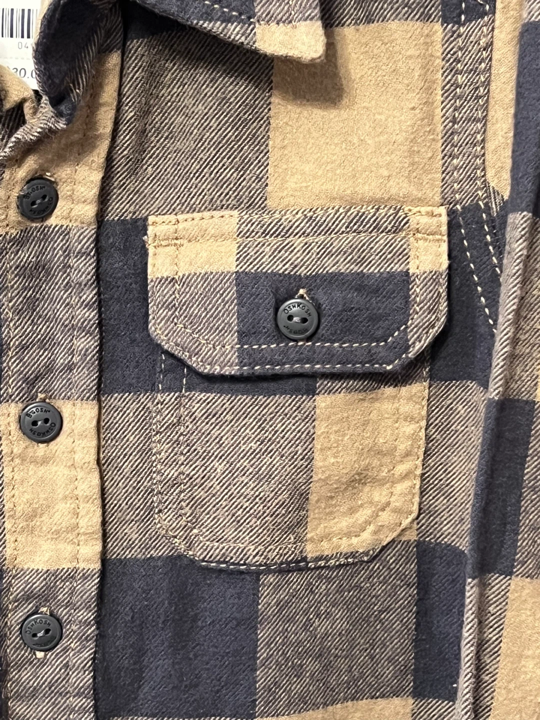 Brand new with tag! Cozy and stylish flannel shirt from OshKosh B’gosh in a tan and charcoal plaid pattern. Perfect for fall, winter, or layering. Quality, durable fabric with front pockets and a button-down design.