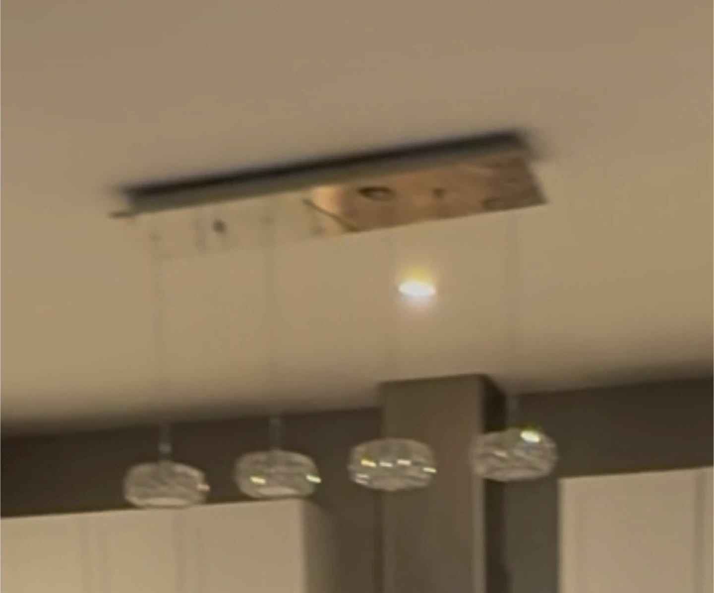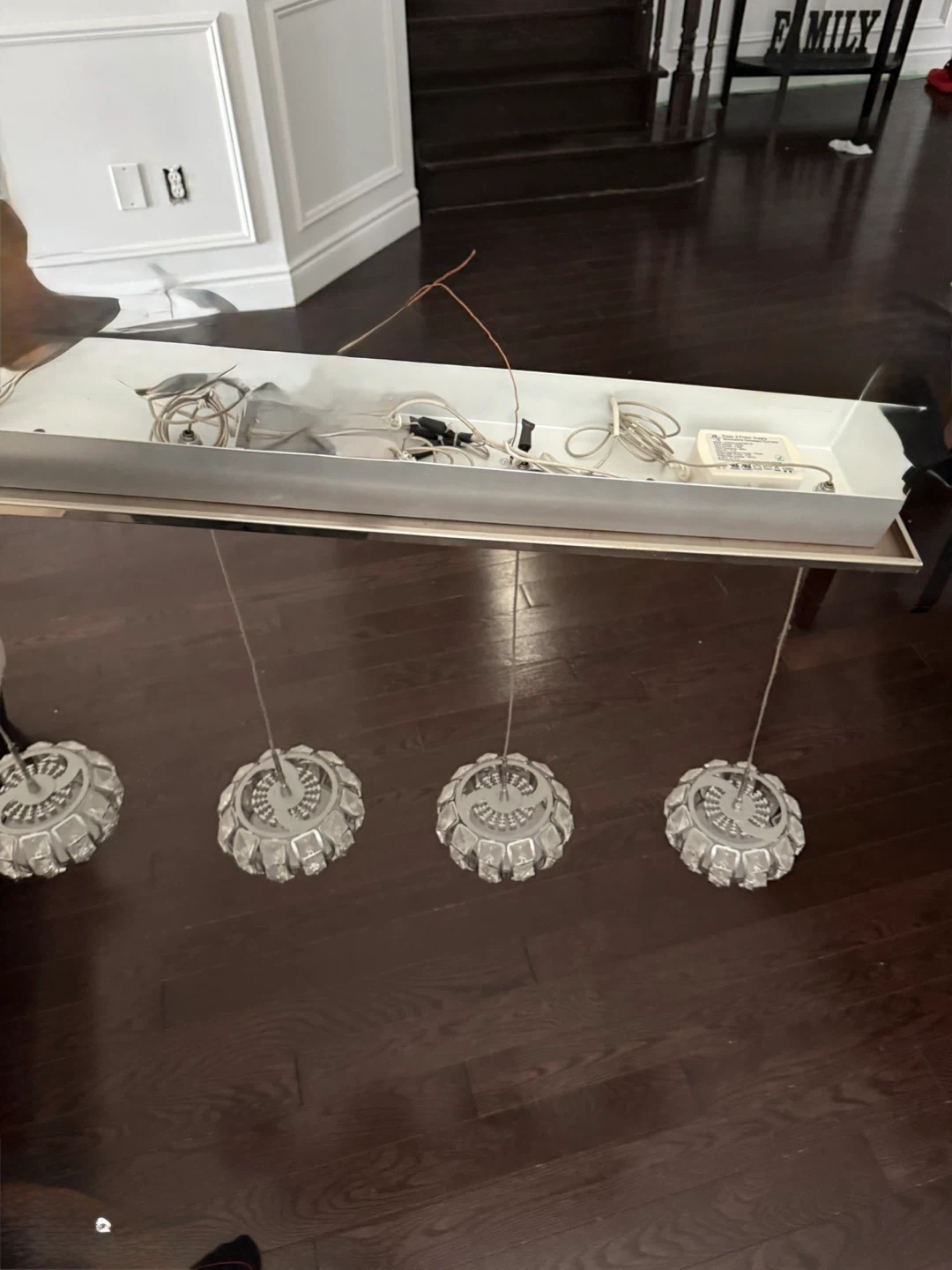 Selling a modern linear chandelier. It features a sleek, rectangular design with four decorative light fixtures. Perfect for adding a touch of elegance to any dining room or living space
