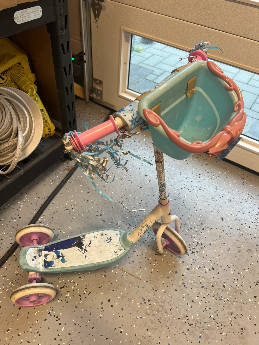This is a children's three-wheeled scooter with a light blue deck and a teal basket. It features a fun design with snowflakes and characters. The handlebars have pink grips and streamers. It's suitable for young riders learning to balance. Great for outdoor play!