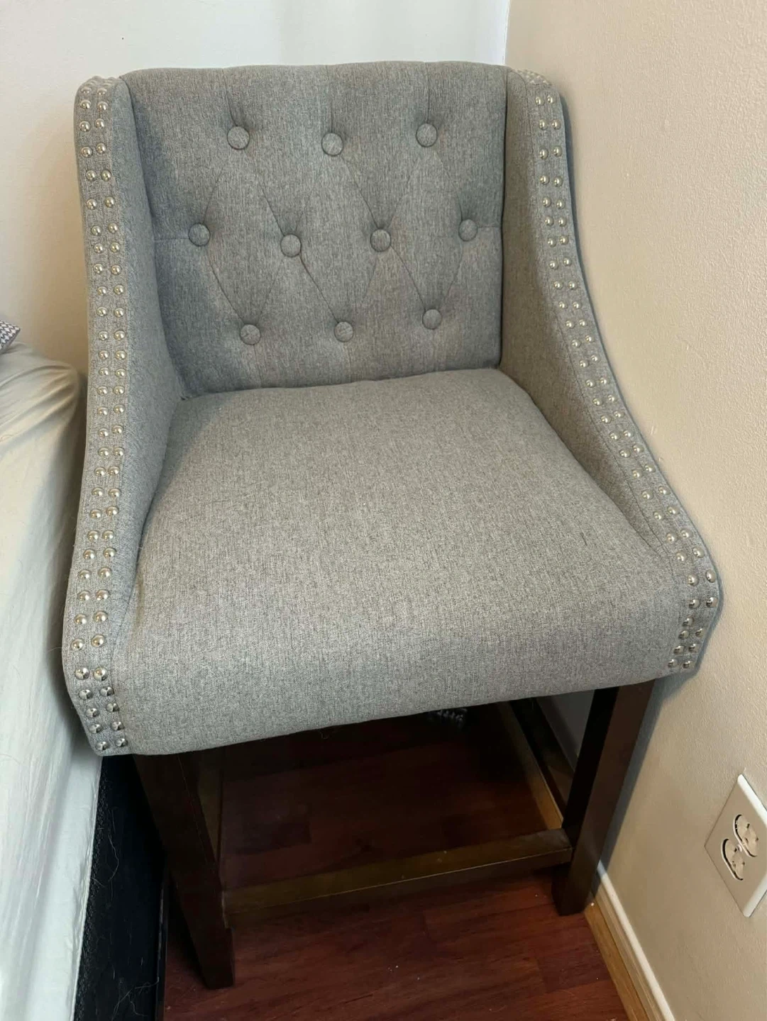 A grey counter stool featuring tufted upholstery and decorative nailhead trim along the edges.