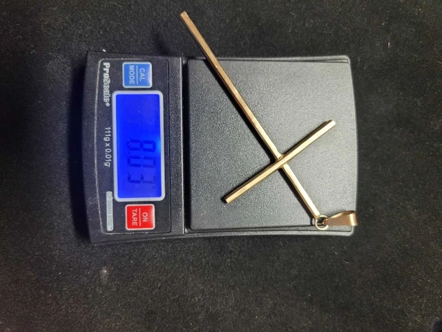 For sale is an 8.03 gram, 14 kt gold, 3" cross. My father had it custom-made at Fooshin jewelry store on Richmond Road in the Glebe. He picked it up this morning, but it turned out to be bigger than expected (3+" instead of 1.5 to 2"). He provided the jeweler with 7.5 grams of 14kt gold and 1.5 grams of 10k gold, totaling 9 grams. The cross weighs 8.03 grams and has no stamp.