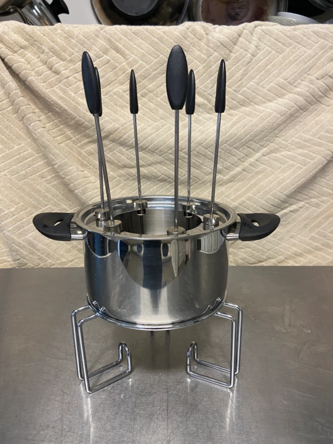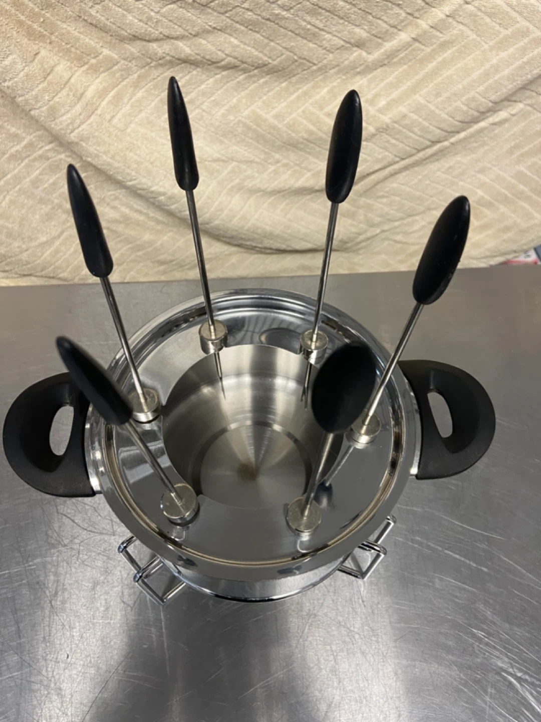Stainless steel fondue pot includes a stand and 6 fondue forks and fork holder. Excellent condition, durable stainless steel.