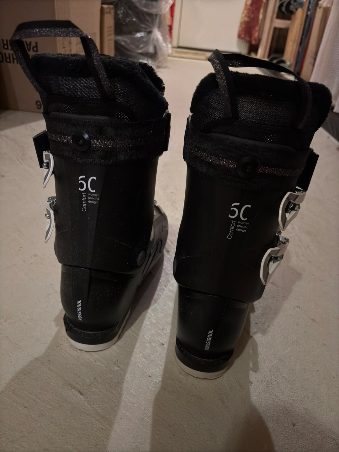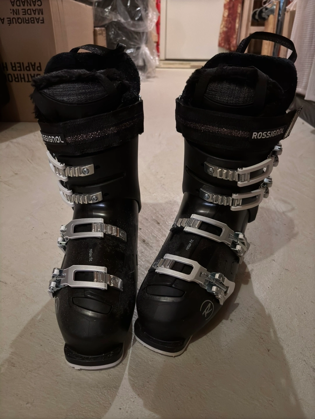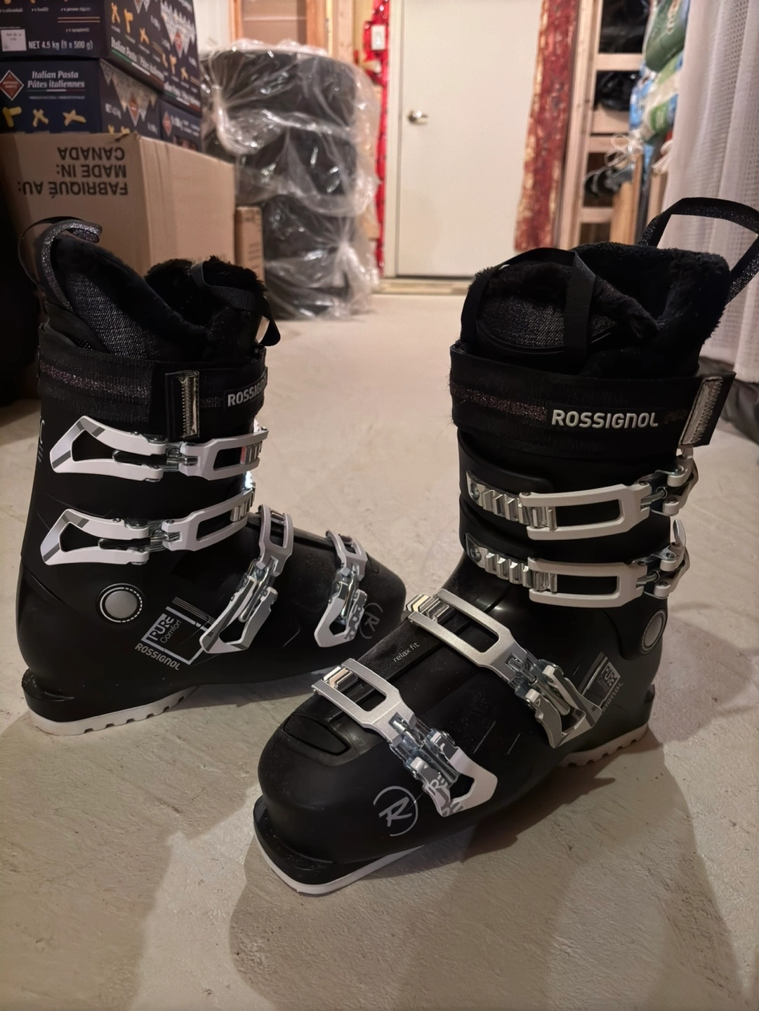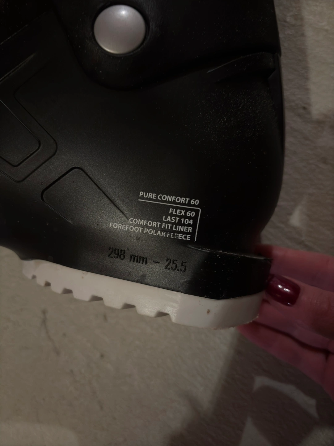 Black ski boots, size 25.5. Women's ski boots with a flex rating of 60. Includes a comfort fit liner and a forefoot polar fleece. New boots, I wore it twice.