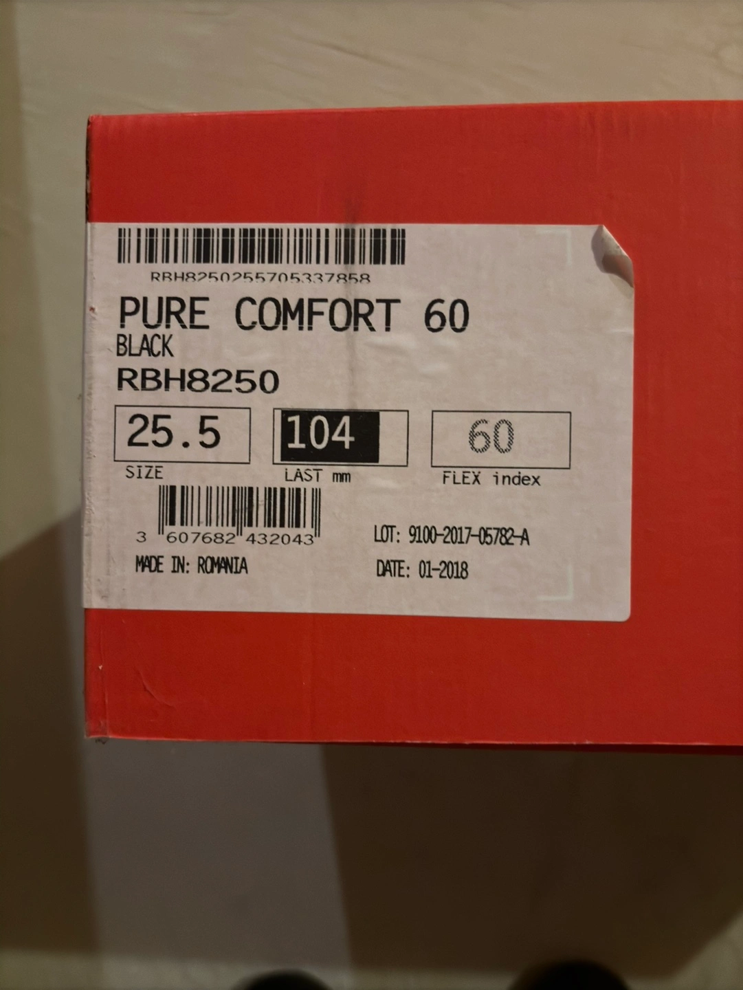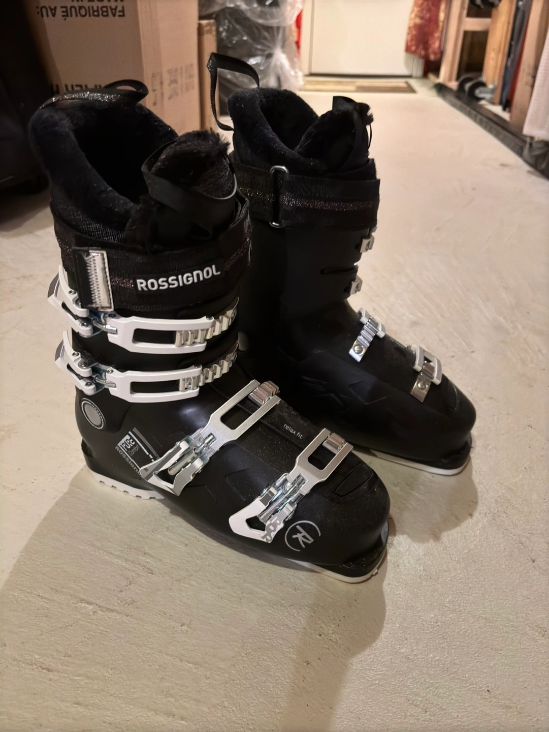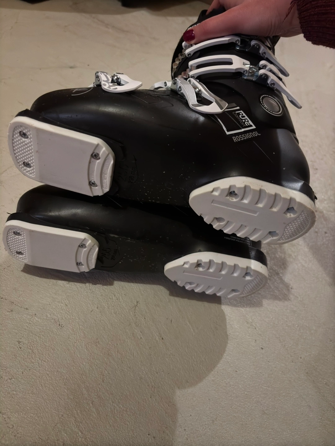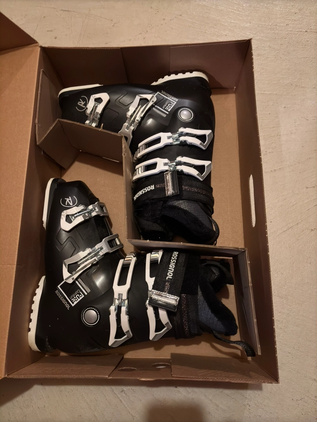 Black ski boots, size 25.5. Women's ski boots with a flex rating of 60. Includes a comfort fit liner and a forefoot polar fleece. New boots, I wore it twice.